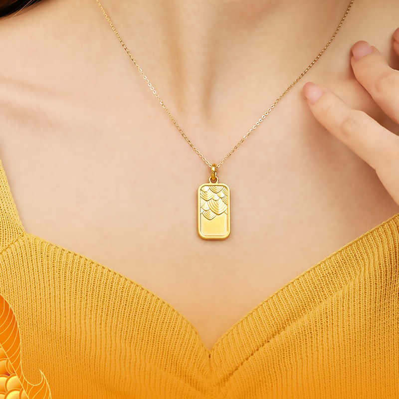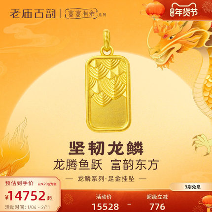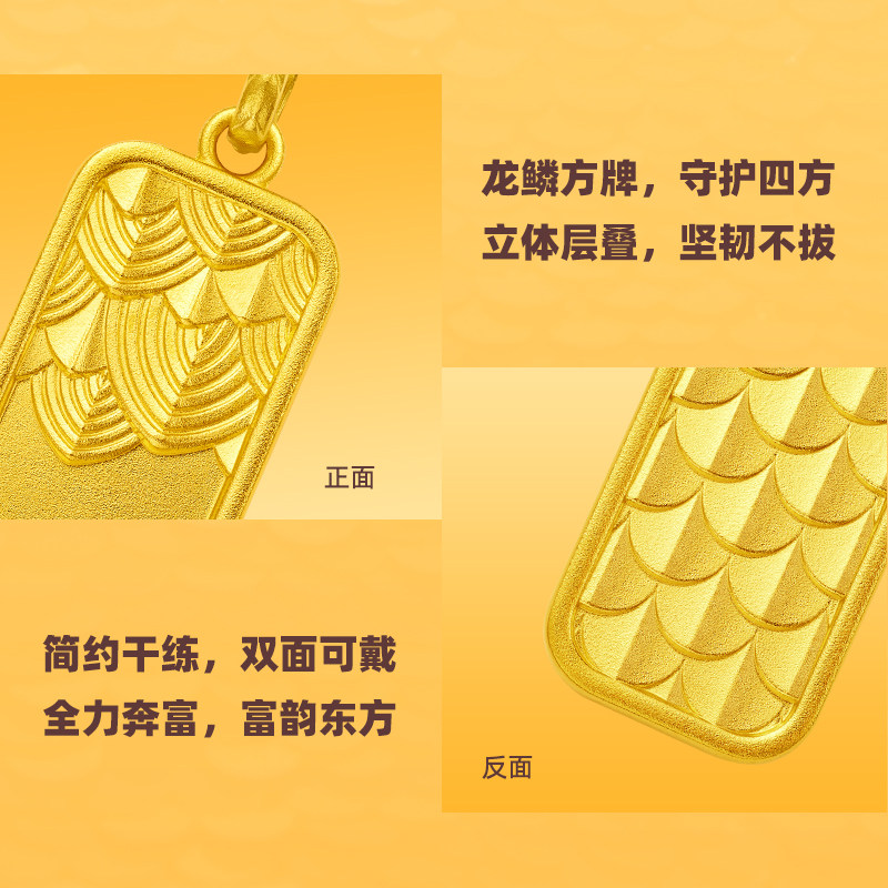 老庙黄金足金999古法富富有余龙鳞挂坠方牌中性守护龙年礼物官方