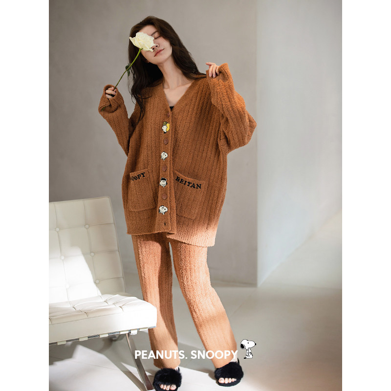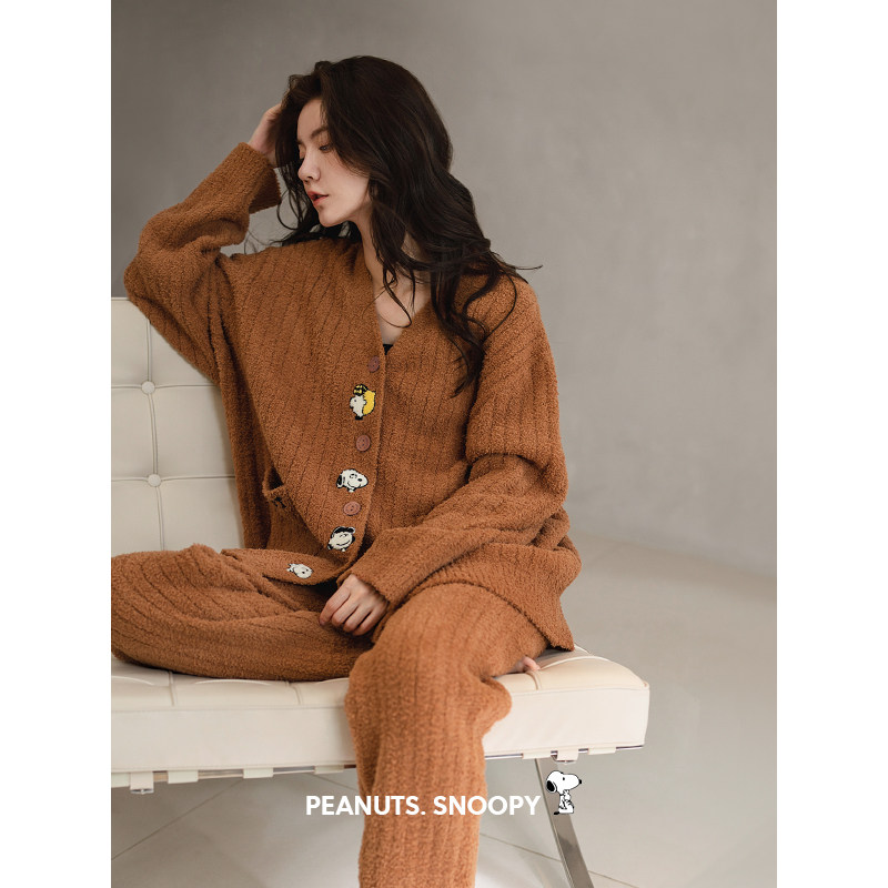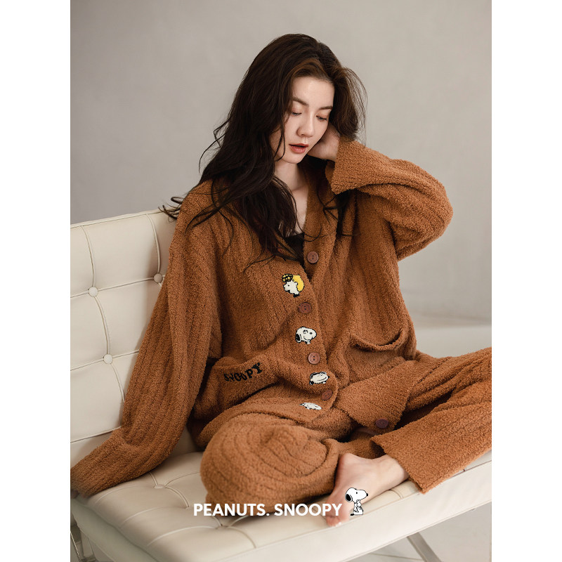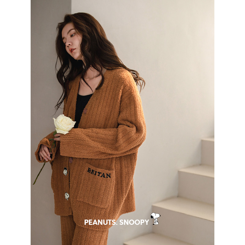 贝妍秋冬珊瑚绒睡衣女款美拉德风套装史努比保暖半边绒开衫家居服