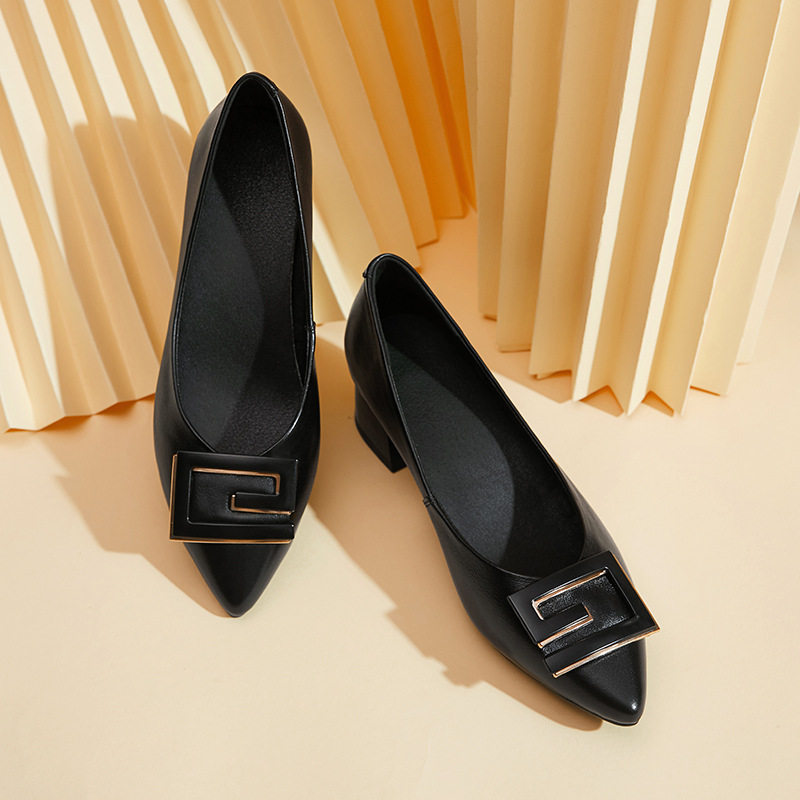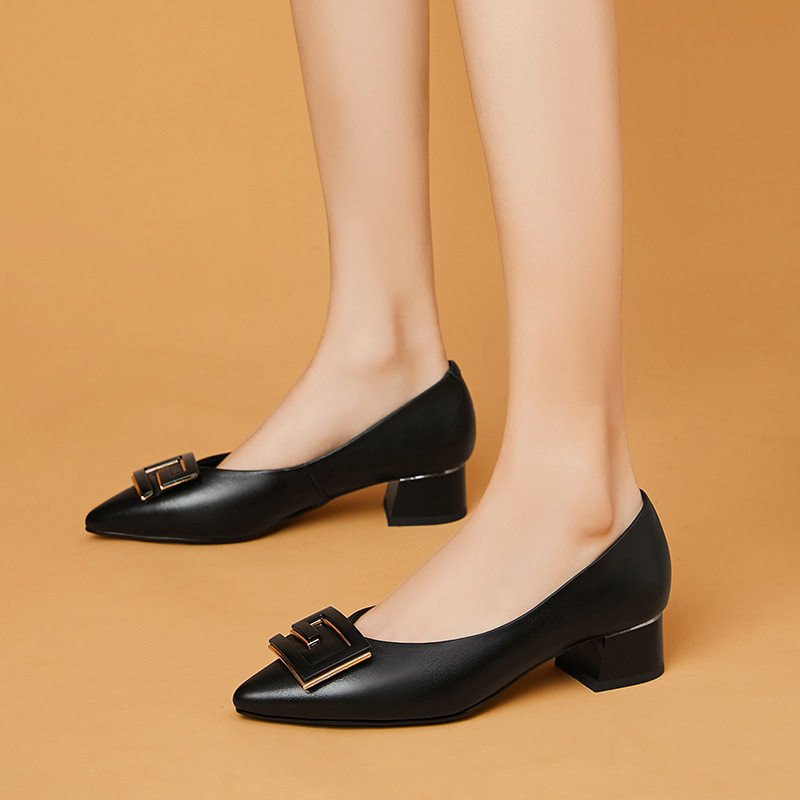 单鞋粗跟女鞋真皮软底白色高跟鞋尖头妈妈鞋时尚中跟中年女士皮鞋