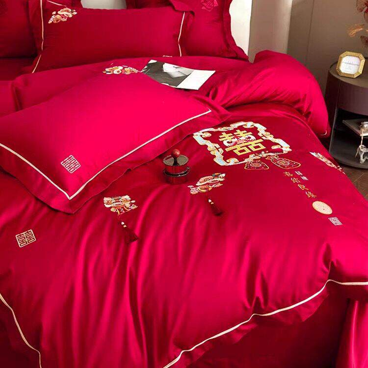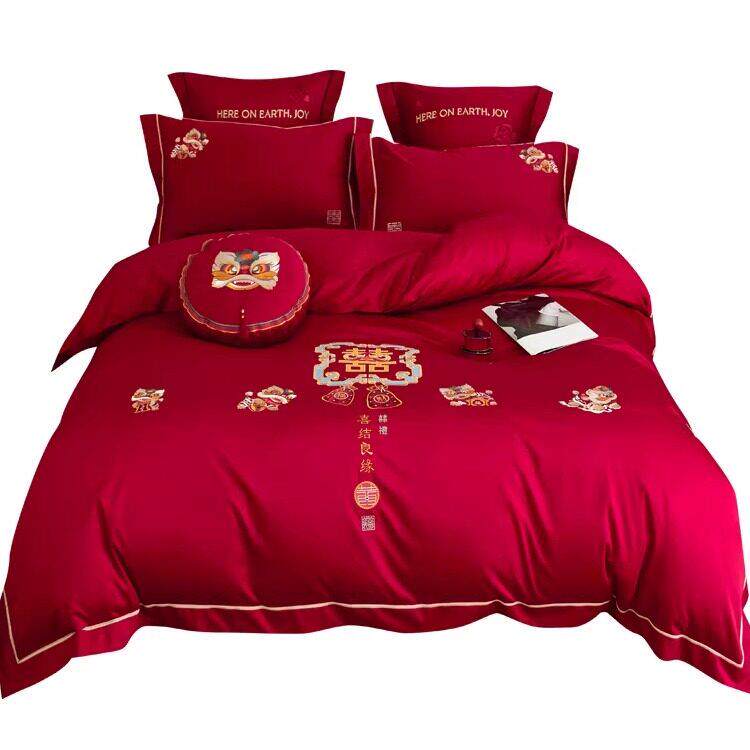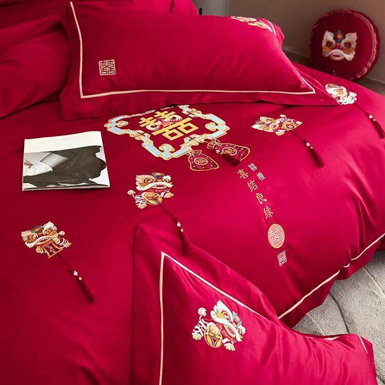 恒洽家纺浪漫婚庆全棉床单款四件套100S刺绣结婚中式被套床上用品