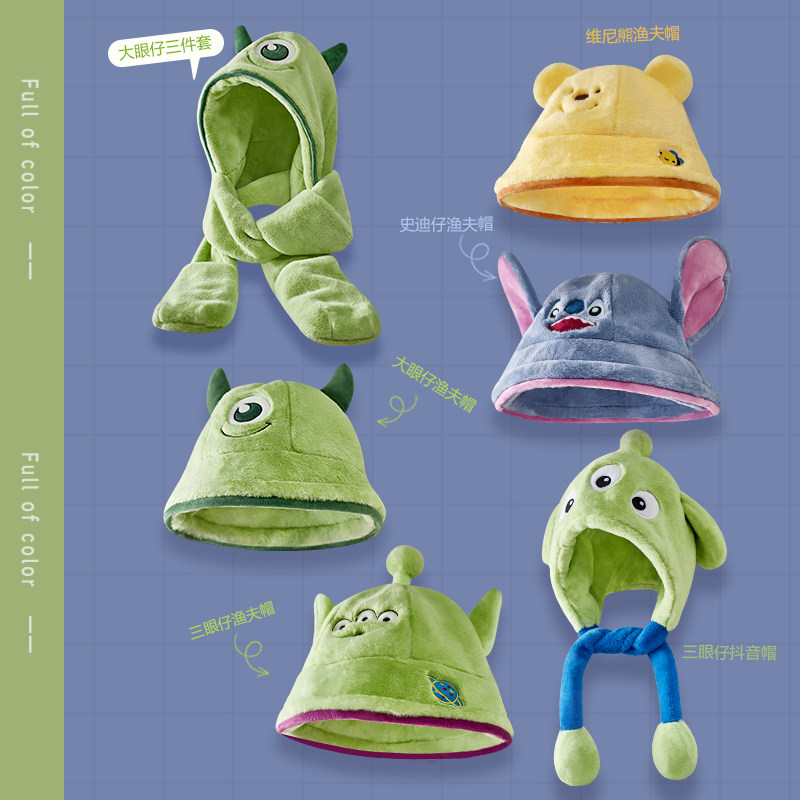 迪士尼史迪仔大眼仔三眼仔维尼熊小怪兽毛绒帽子女冬季保暖渔夫帽