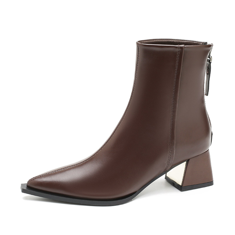 真皮尖头高跟短靴女2025年新款春秋单靴瘦瘦靴棕色粗跟秋冬靴子女