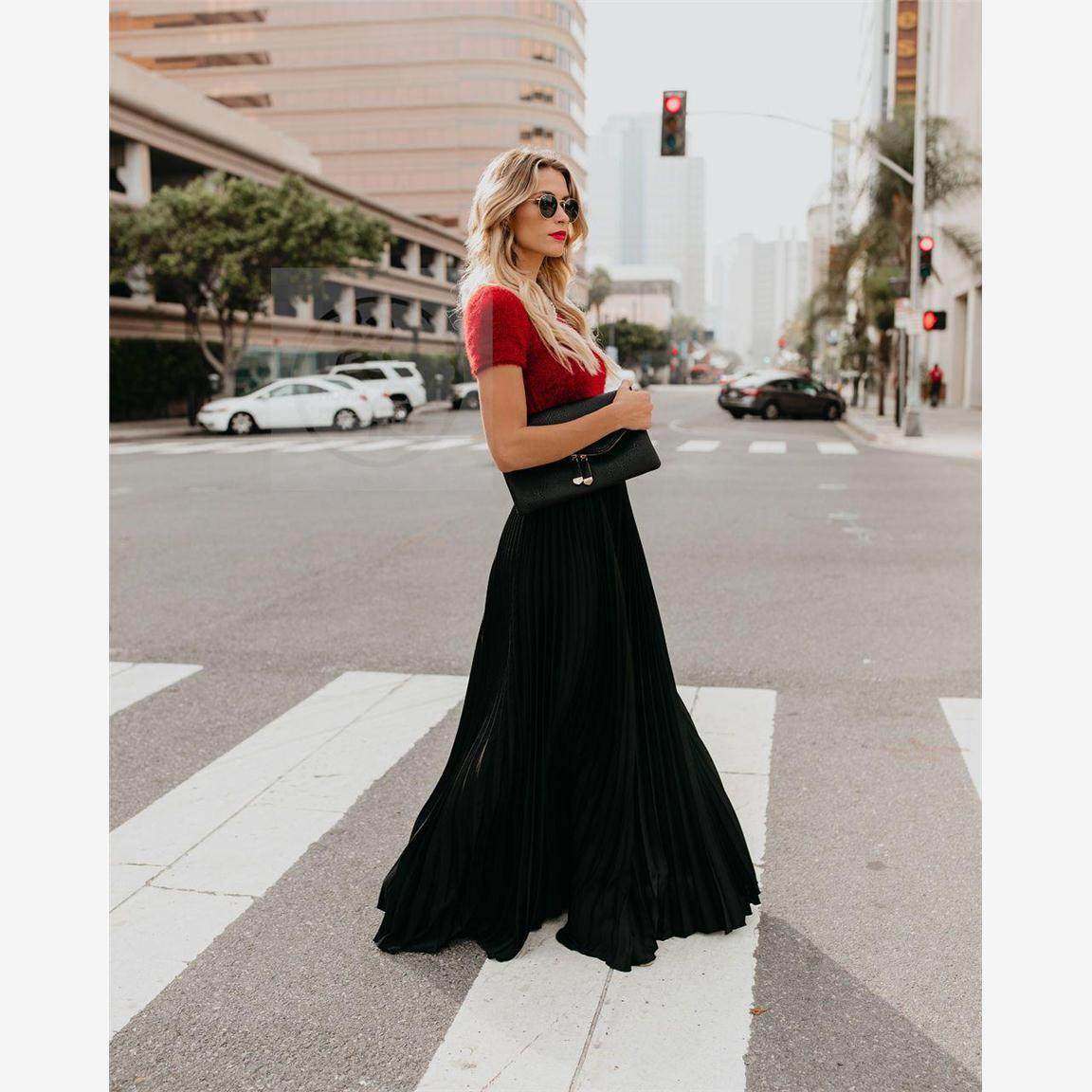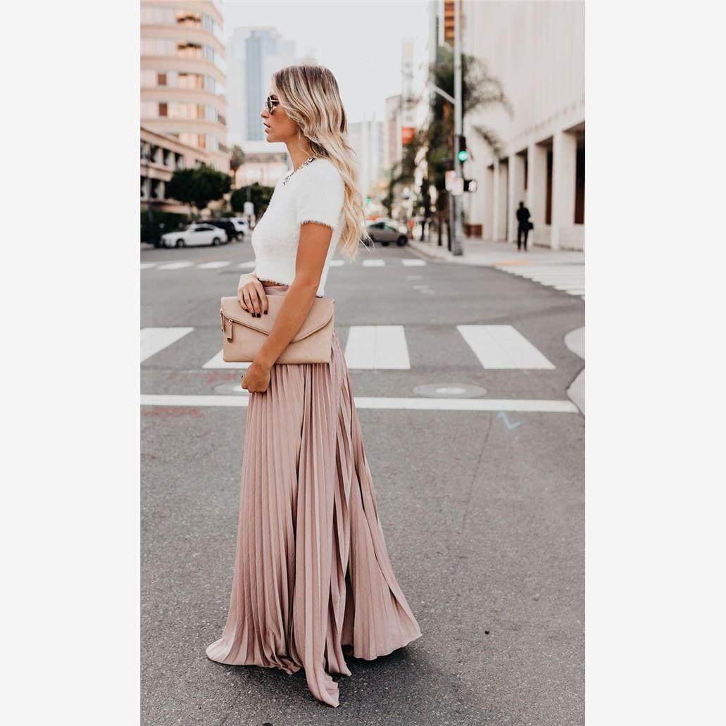 欧洲站波西米亚风时尚粉色百褶度假沙滩大摆半身裙舞蹈长裙S-2XL