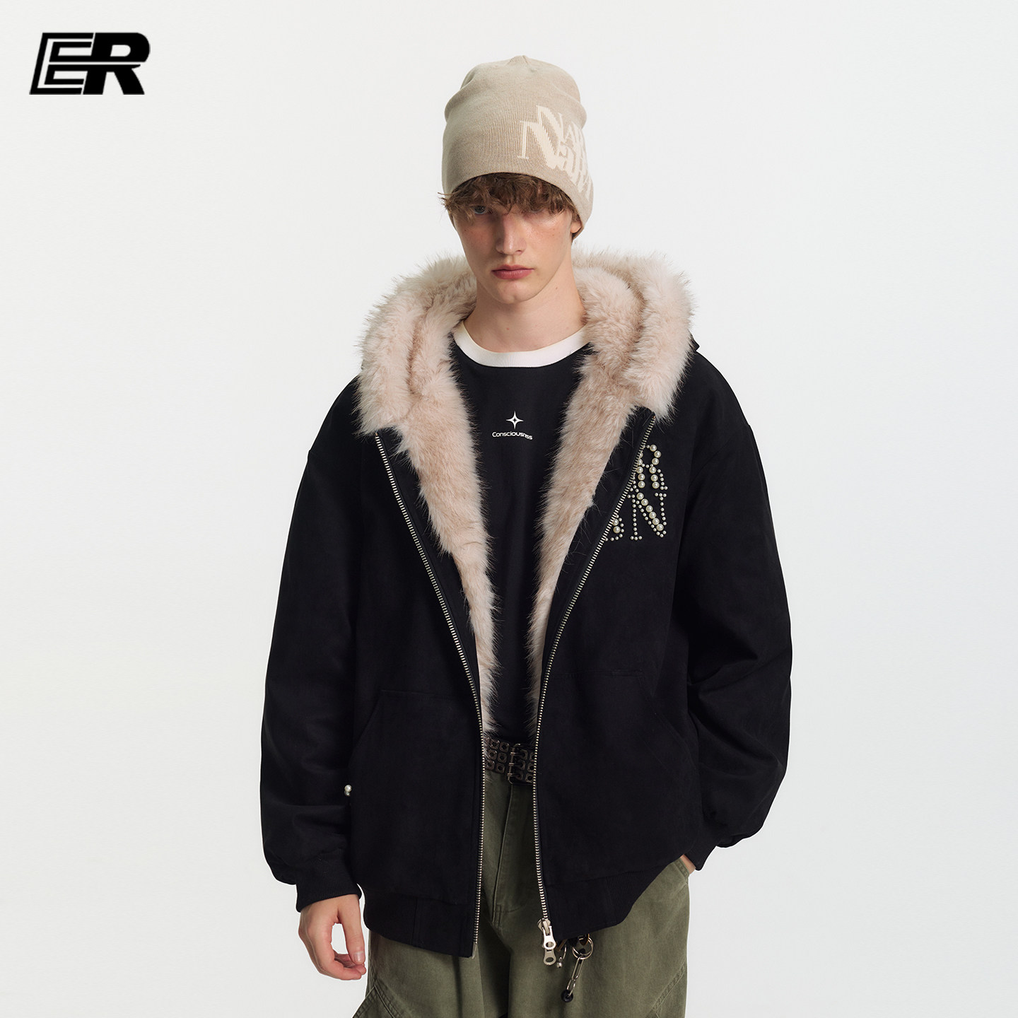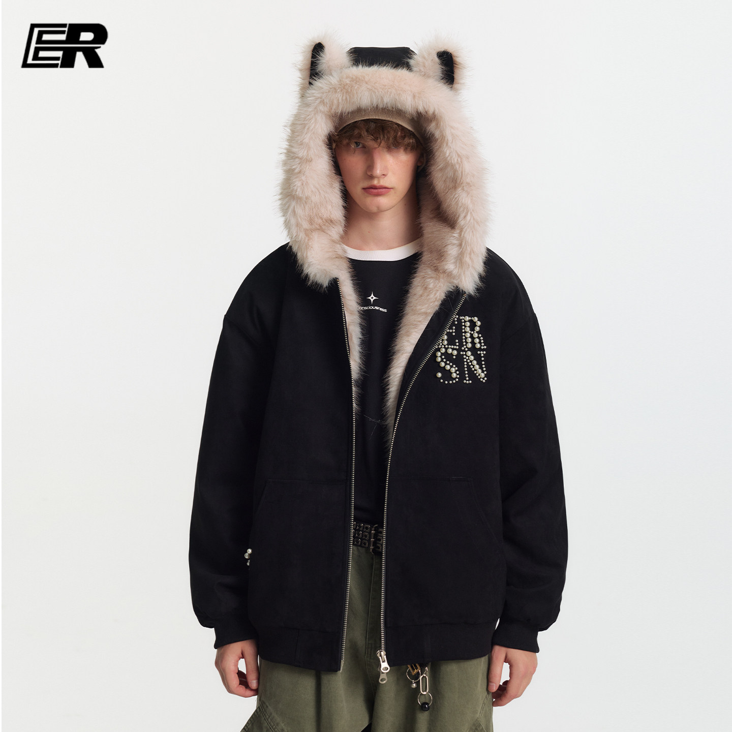ER珍珠logo兔耳朵座山雕连帽外套