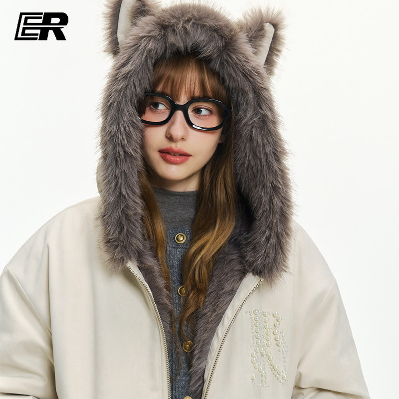 ER兔耳朵座山雕连帽外套2026冬珍珠logo毛领夹克美式潮牌男女棉服