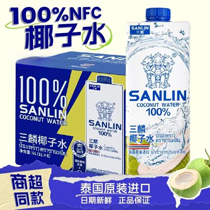 三麟100%椰子水1L 泰国进口SANLIN富含天然电解质补水椰青NFC果汁
