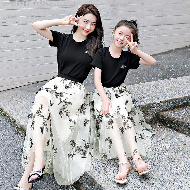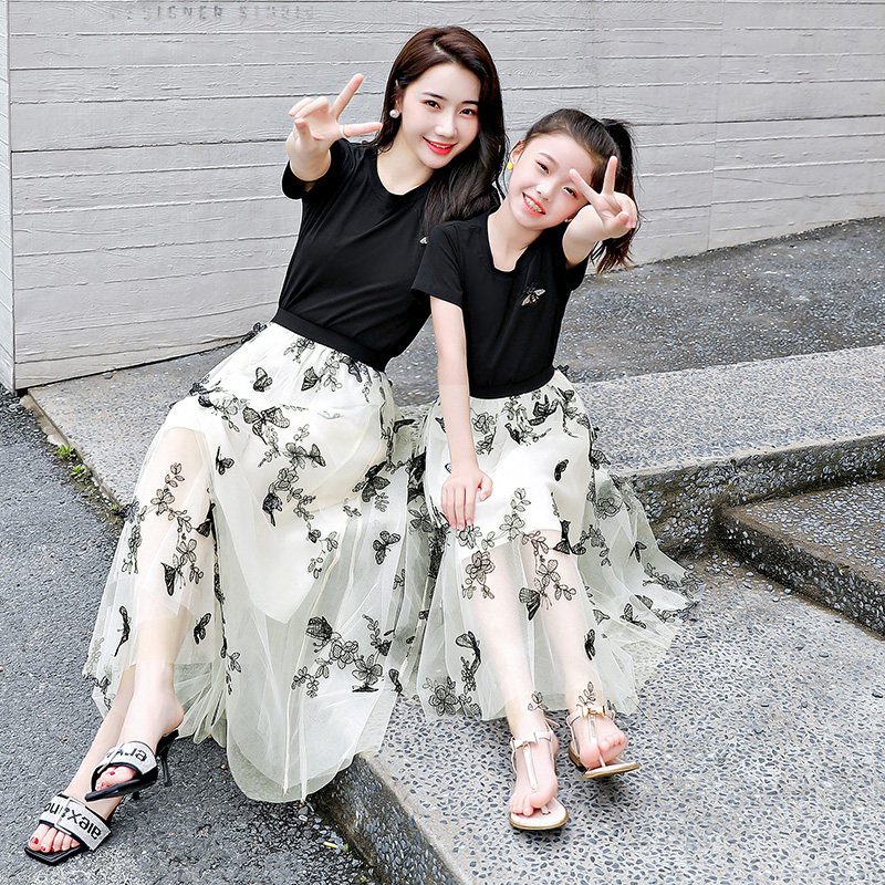 亲子装母女套装连衣裙夏装新款短袖t恤两件套网纱半身裙洋气网红