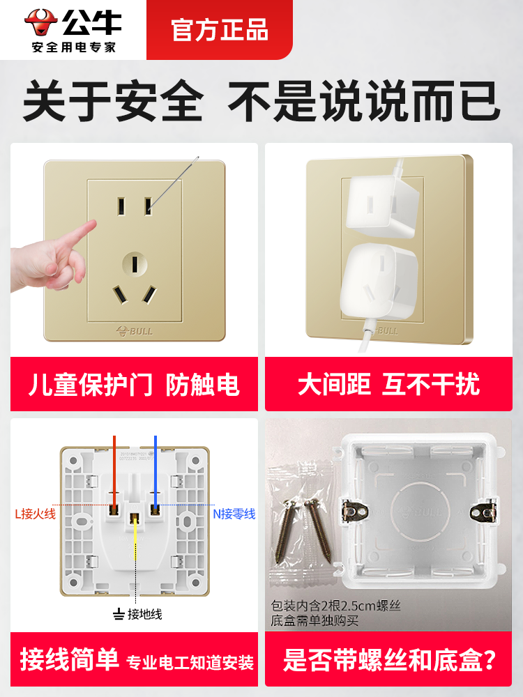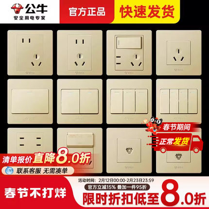 公牛开关插座面板家用86型5五孔旗舰暗装16A墙壁USB带开关面板金