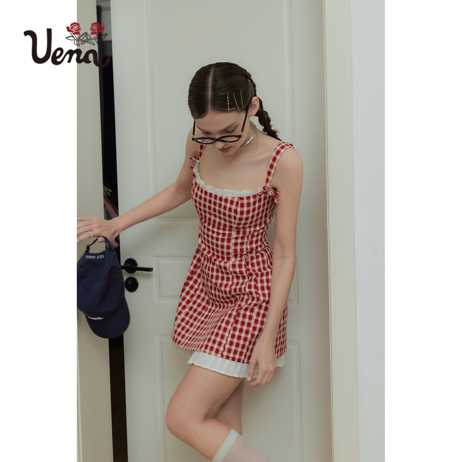 【樱海学社】Uena美式复古撞色格纹假两件吊带裙A字收腰连衣裙女