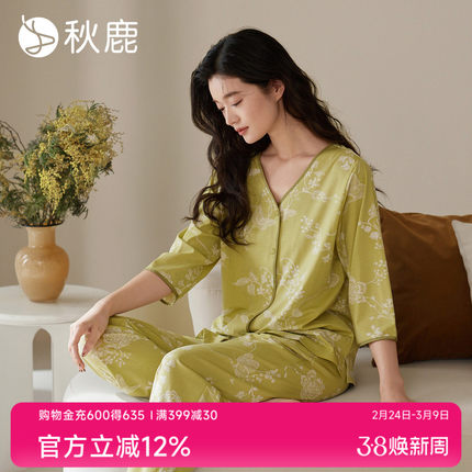 秋鹿显瘦V领柔软莫代尔睡衣女士2026新款七分袖家居服套装可外穿