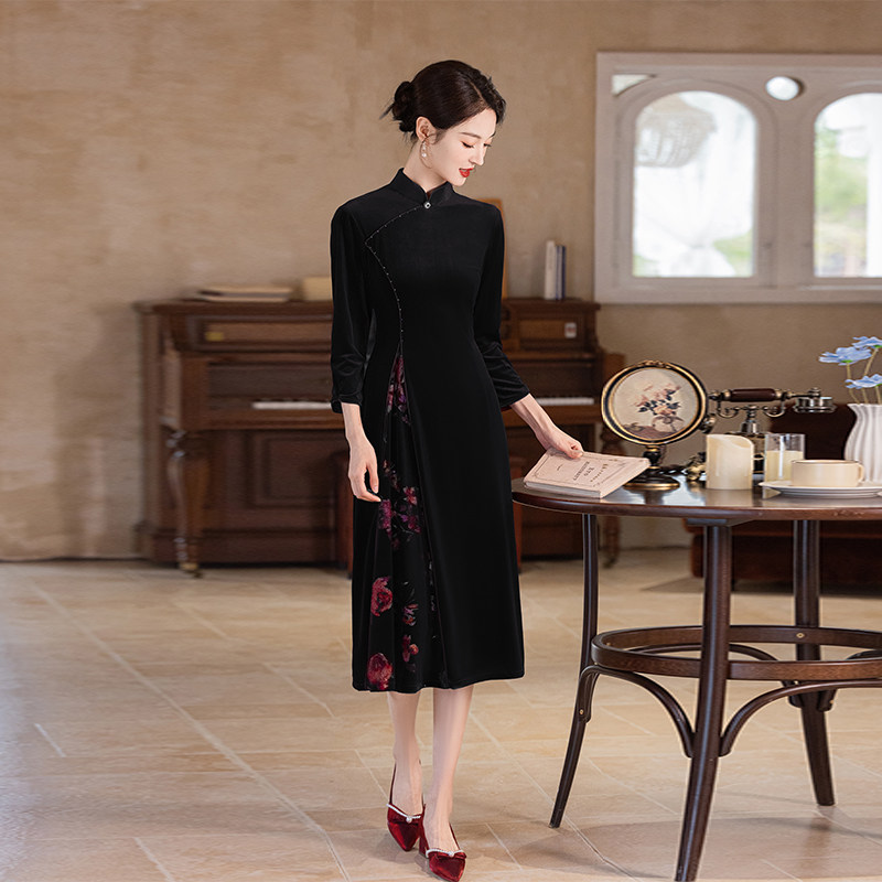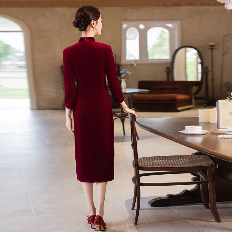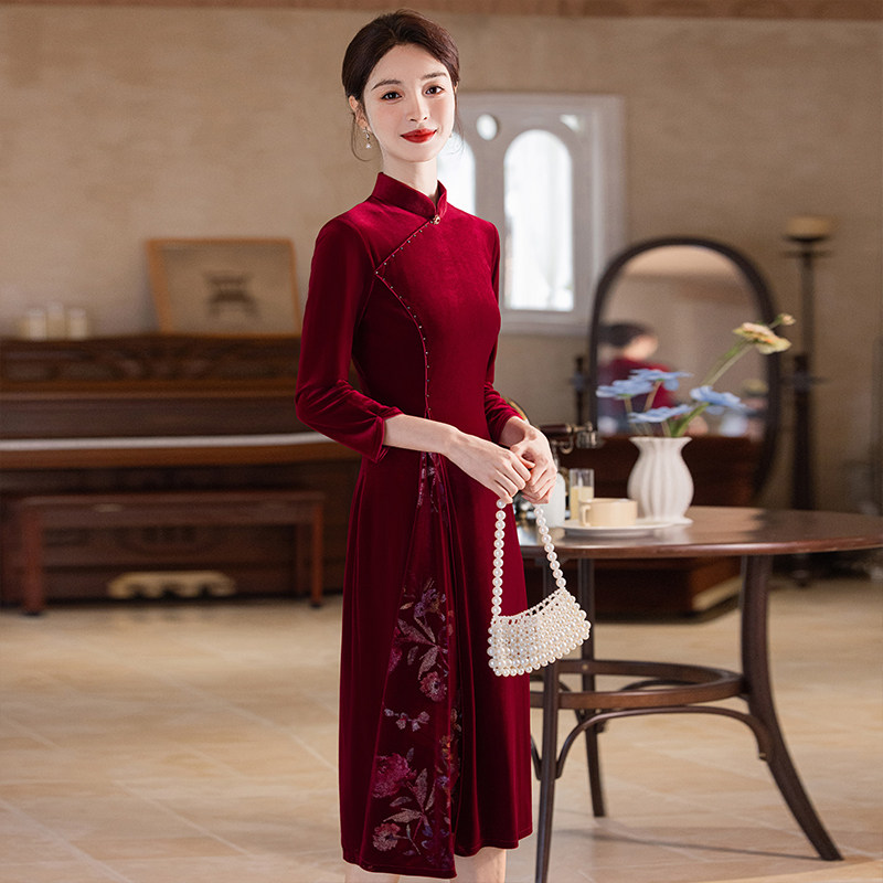 旗袍2025年秋冬新款改良中长款红色金丝绒连衣裙妈妈日常礼服复古
