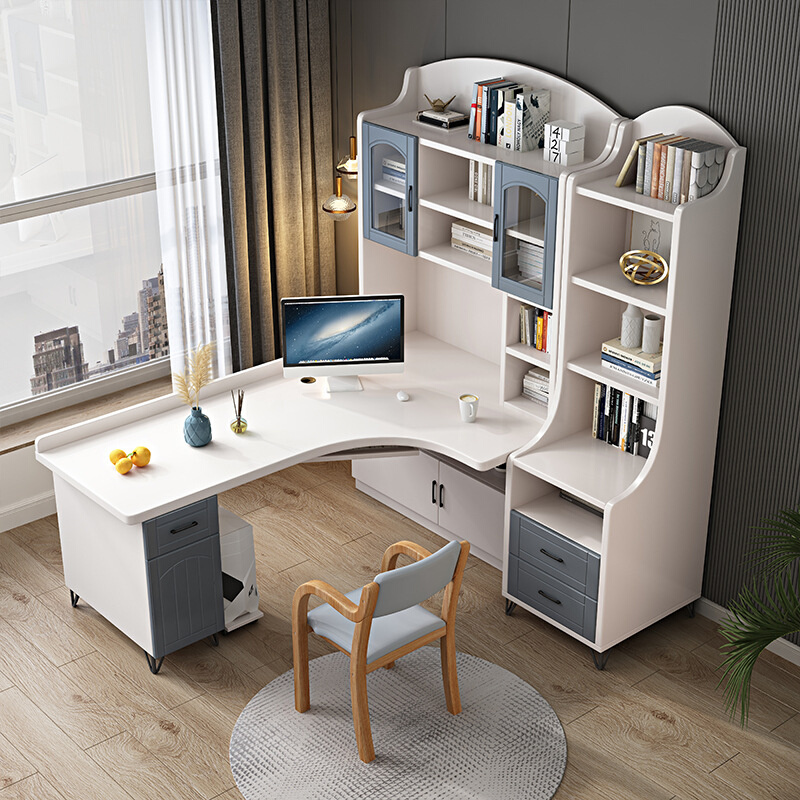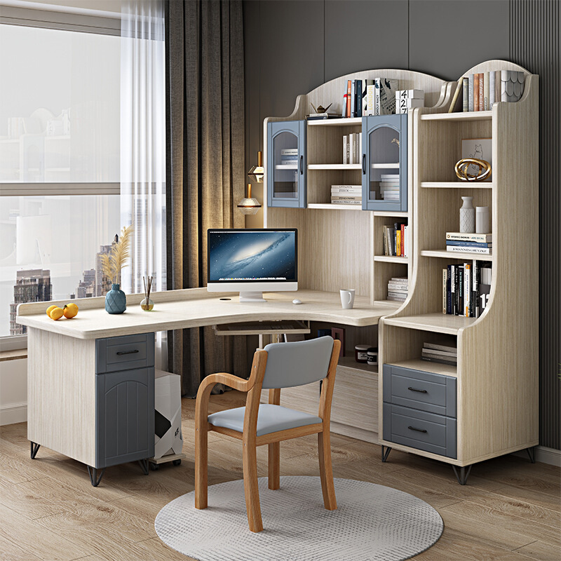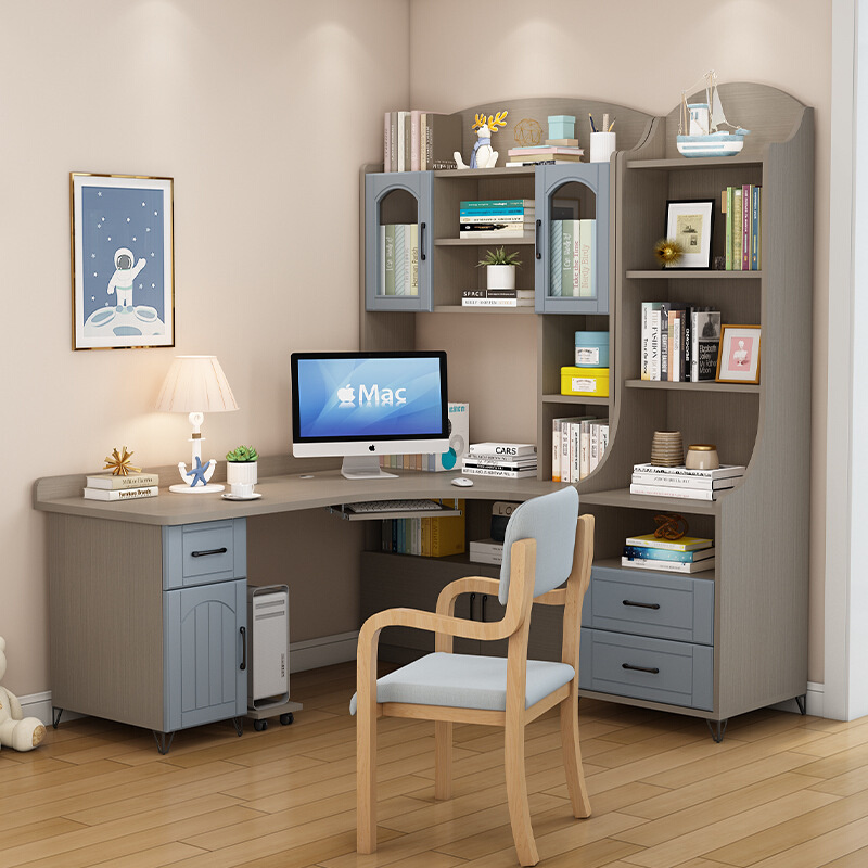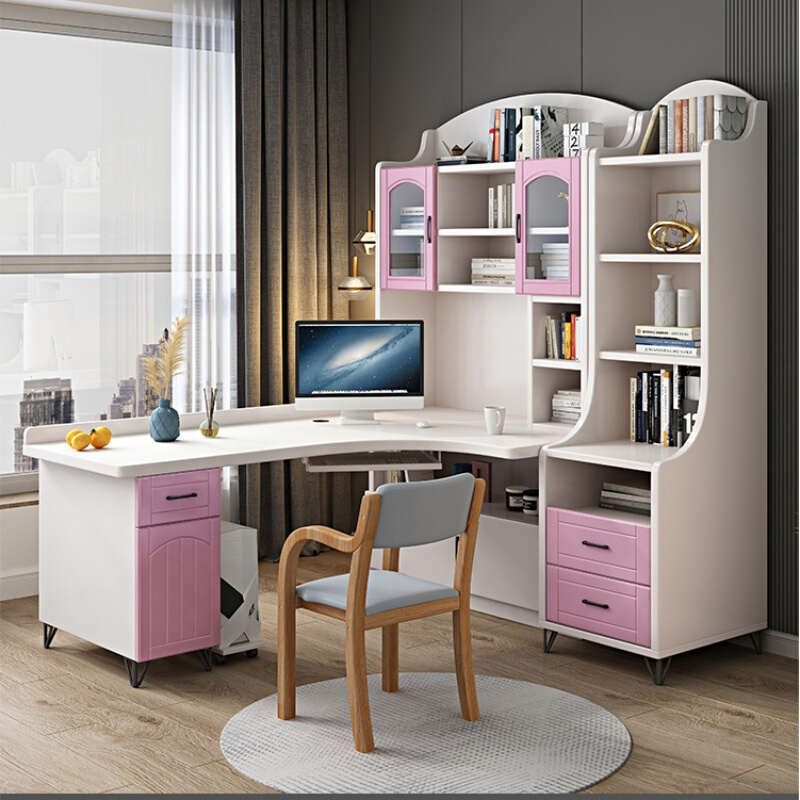 书桌书架一体家用简约儿童学习桌子实木书桌带书柜转角台式电脑桌