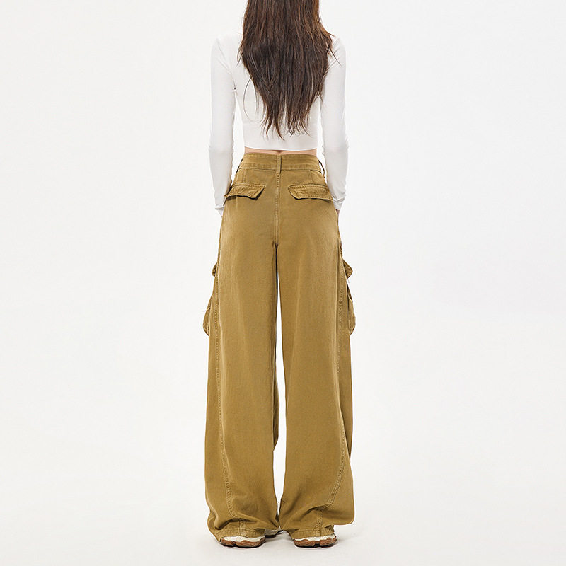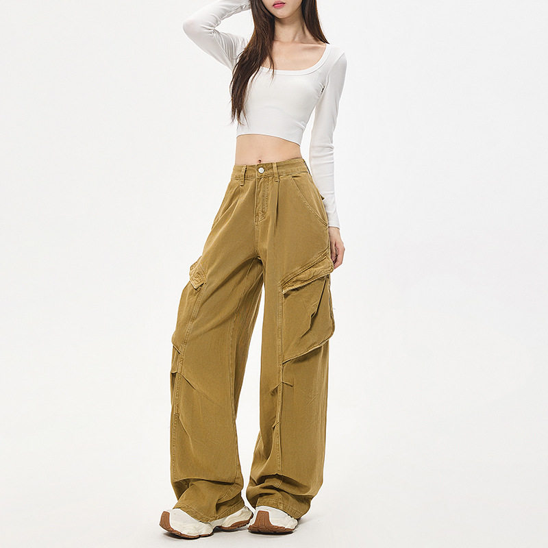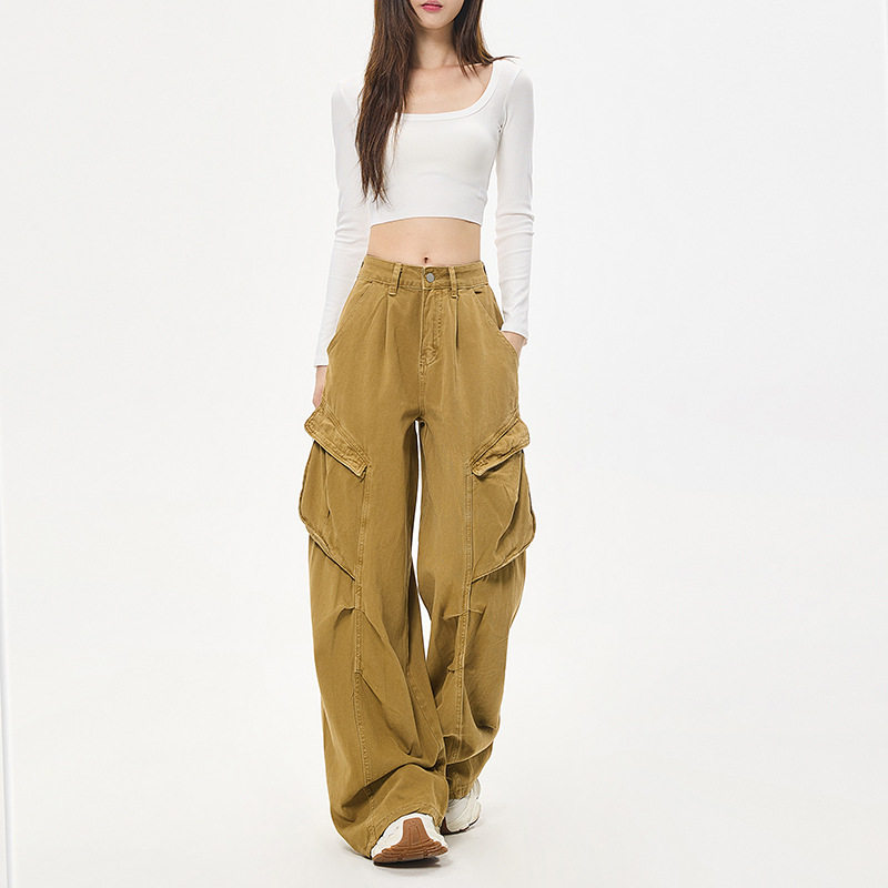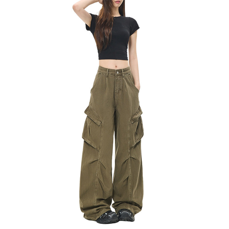 美式复古宽松拖地工装牛仔裤女春秋大口袋褶皱设计