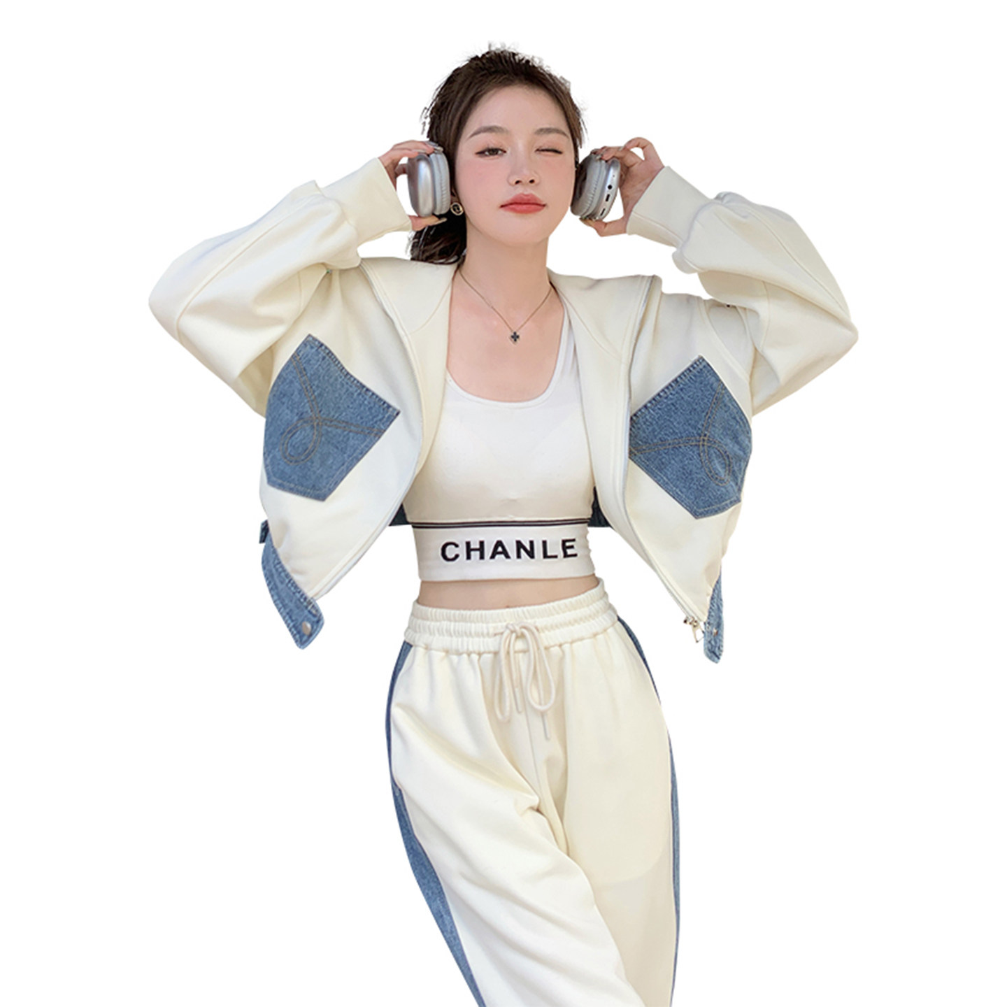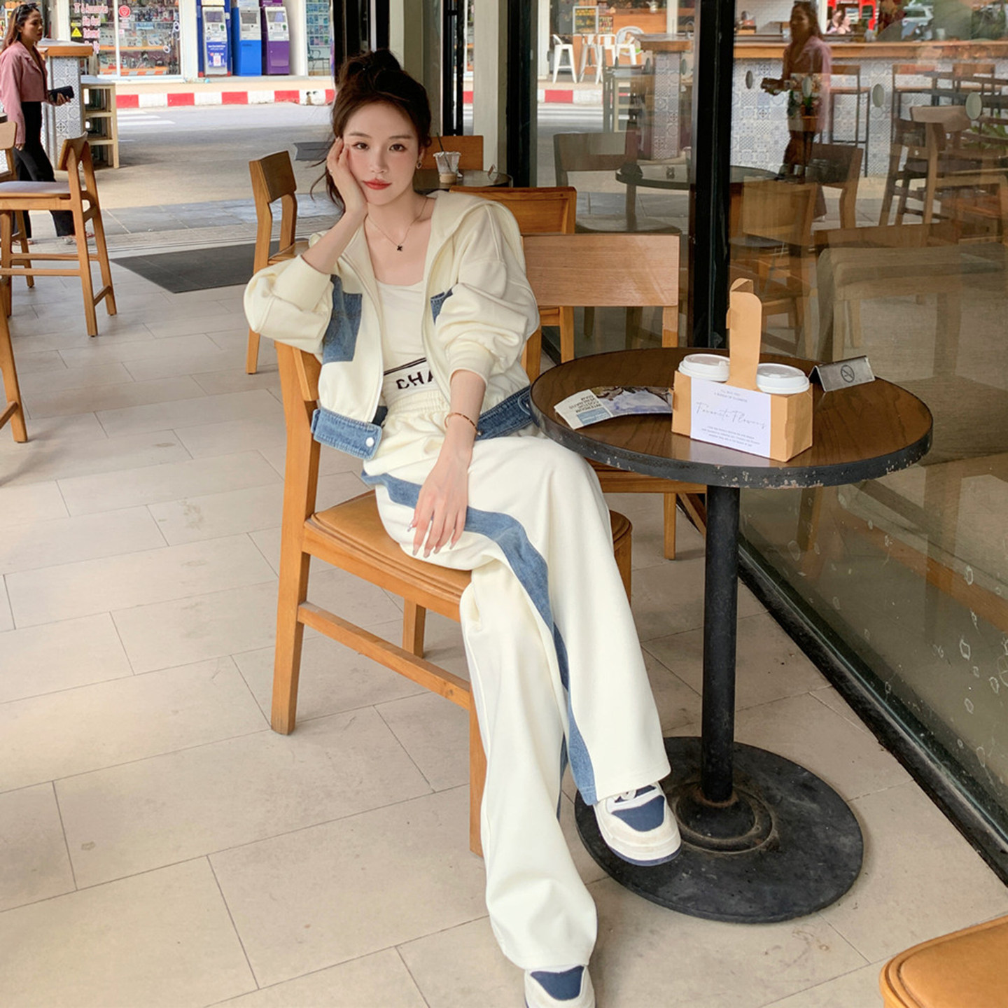 白色牛仔拼接休闲运动套装女春秋2026新款两件套流行减龄学院风