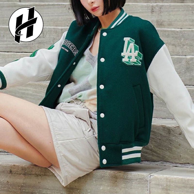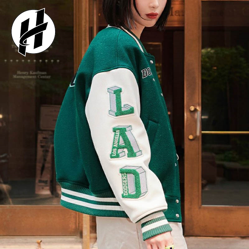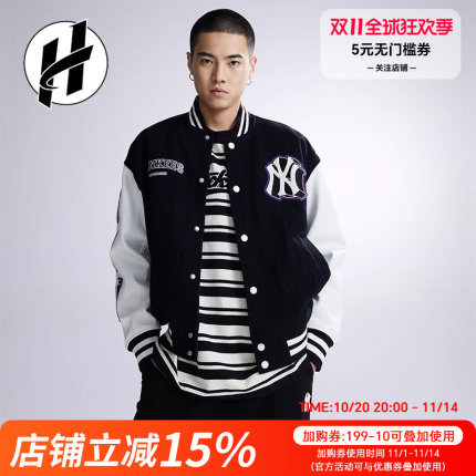 清仓 MLB字母印花黑色棒球服男女同款刺绣单排扣宽松保暖夹克外套