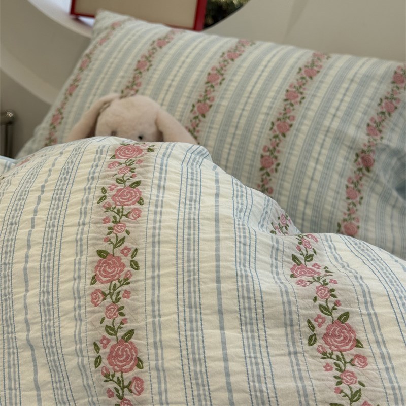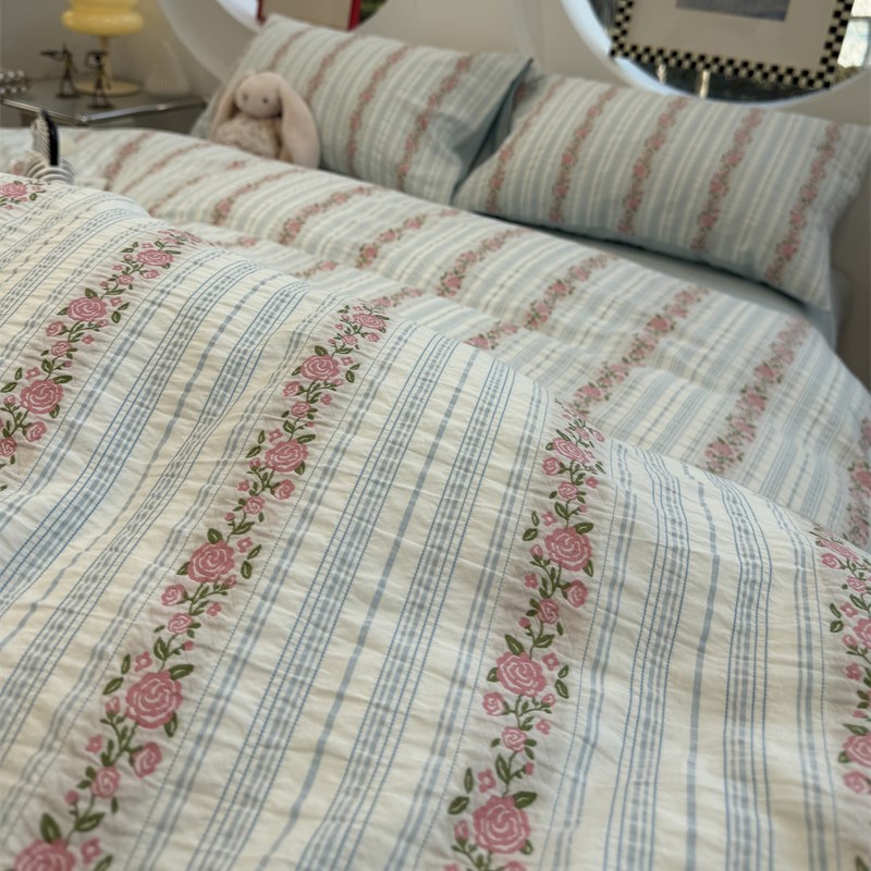 田园水洗棉提花蓝条纹蔷薇床上四件套全棉1.5m1.8米公寓被套