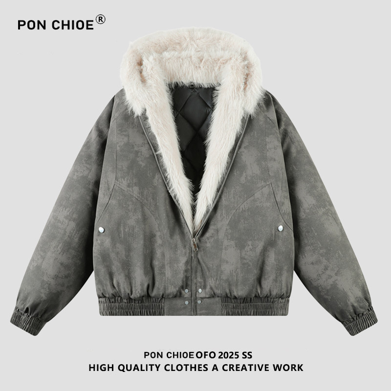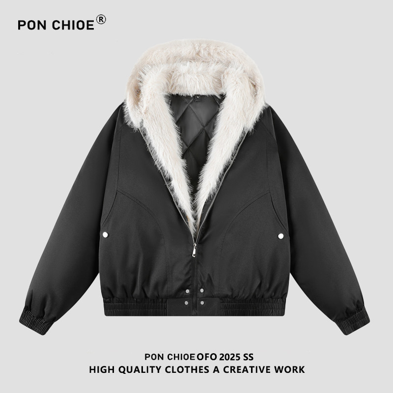 ponchioe冬季毛领座山雕保暖棉服男2025美式宽松情侣百搭加厚棉衣