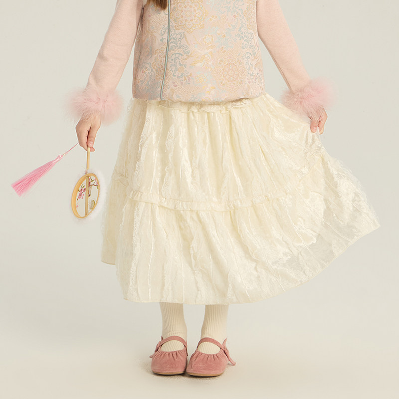 Yumi妈女童拜冬年服冬装版蕾丝半身裙精致百搭提花长裙子25M071