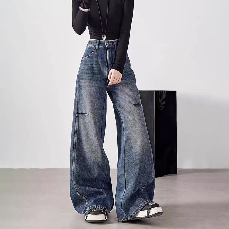 OIOI美式复古春夏季女设计高腰宽松新款弯刀牛仔裤显瘦拖地阔腿裤