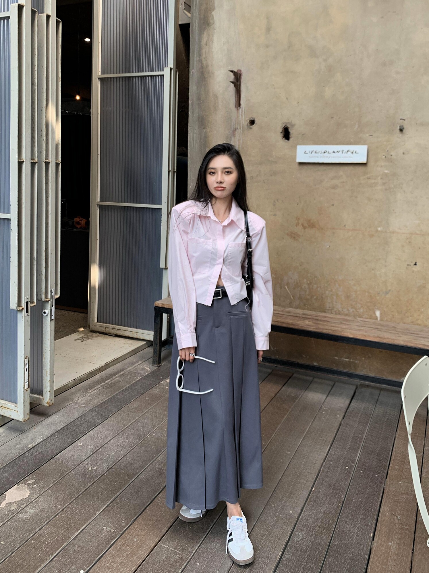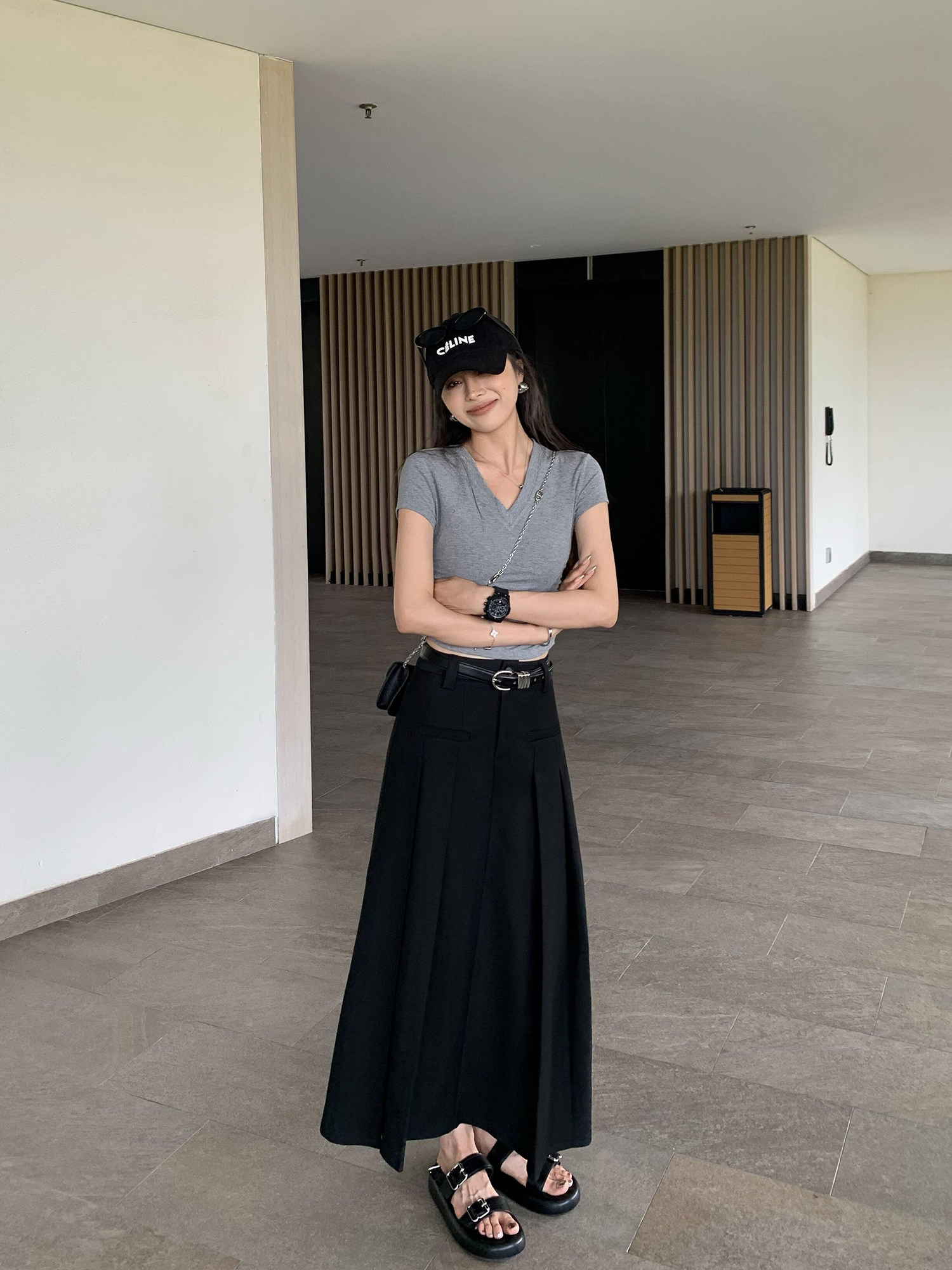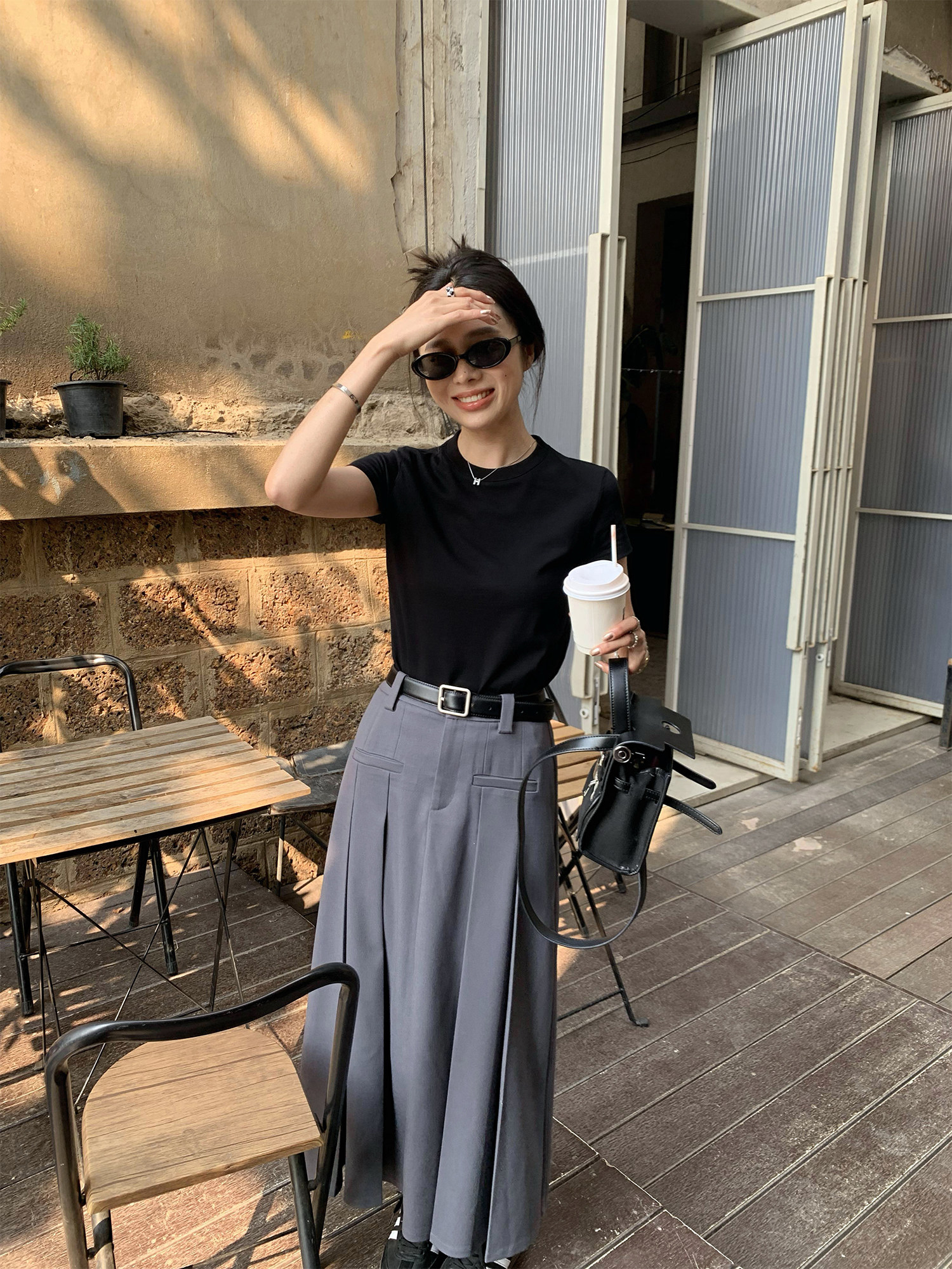 辰米范 灰色高腰西装半身裙女2025春秋显瘦a字裙设计感百褶长裙