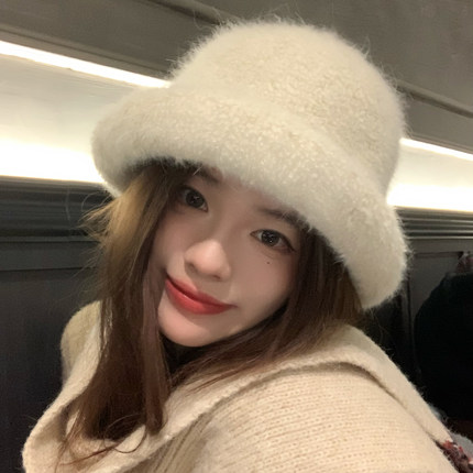 蜗牛爬爬家兔毛礼帽女秋冬防寒卷边渔夫帽保暖白色毛绒盆帽显脸小