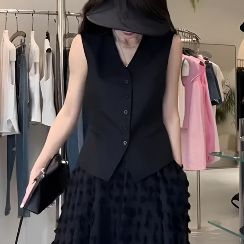 法式高级感黑色v领无袖西