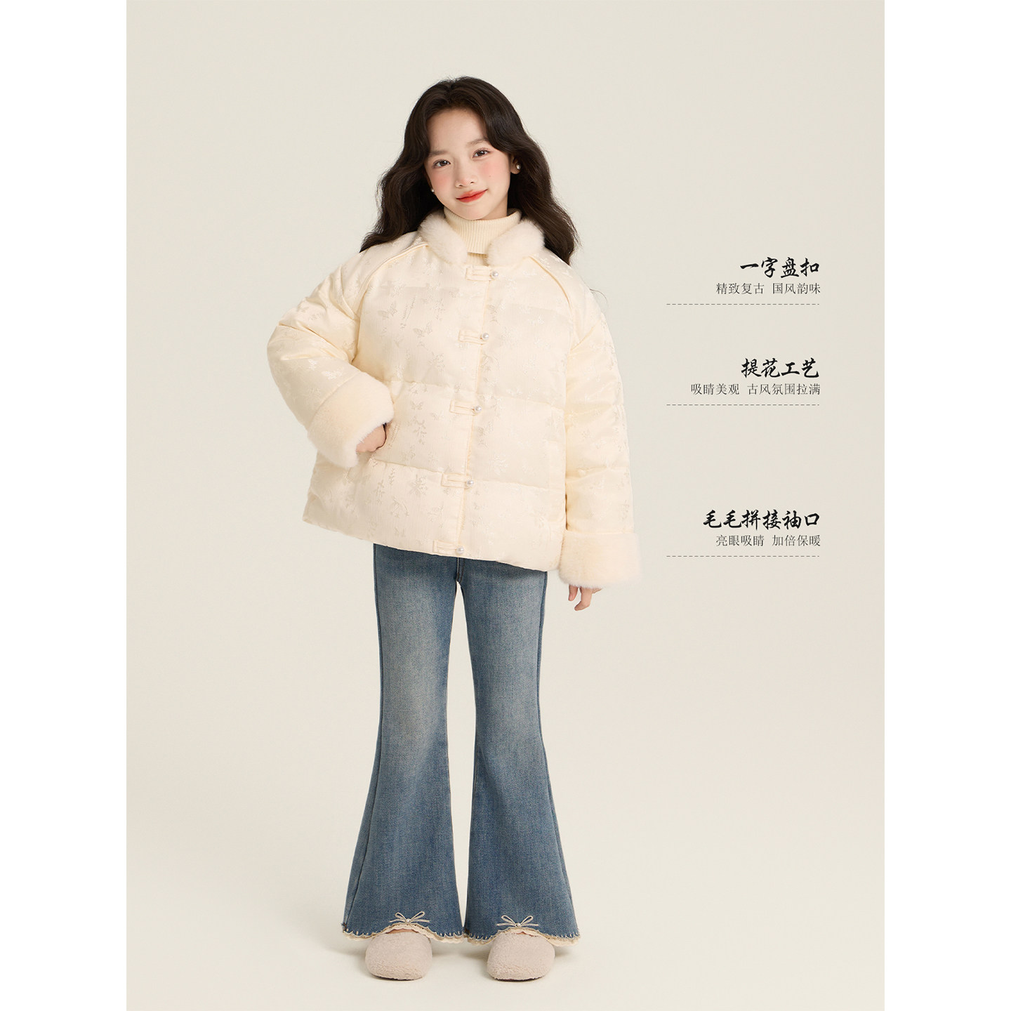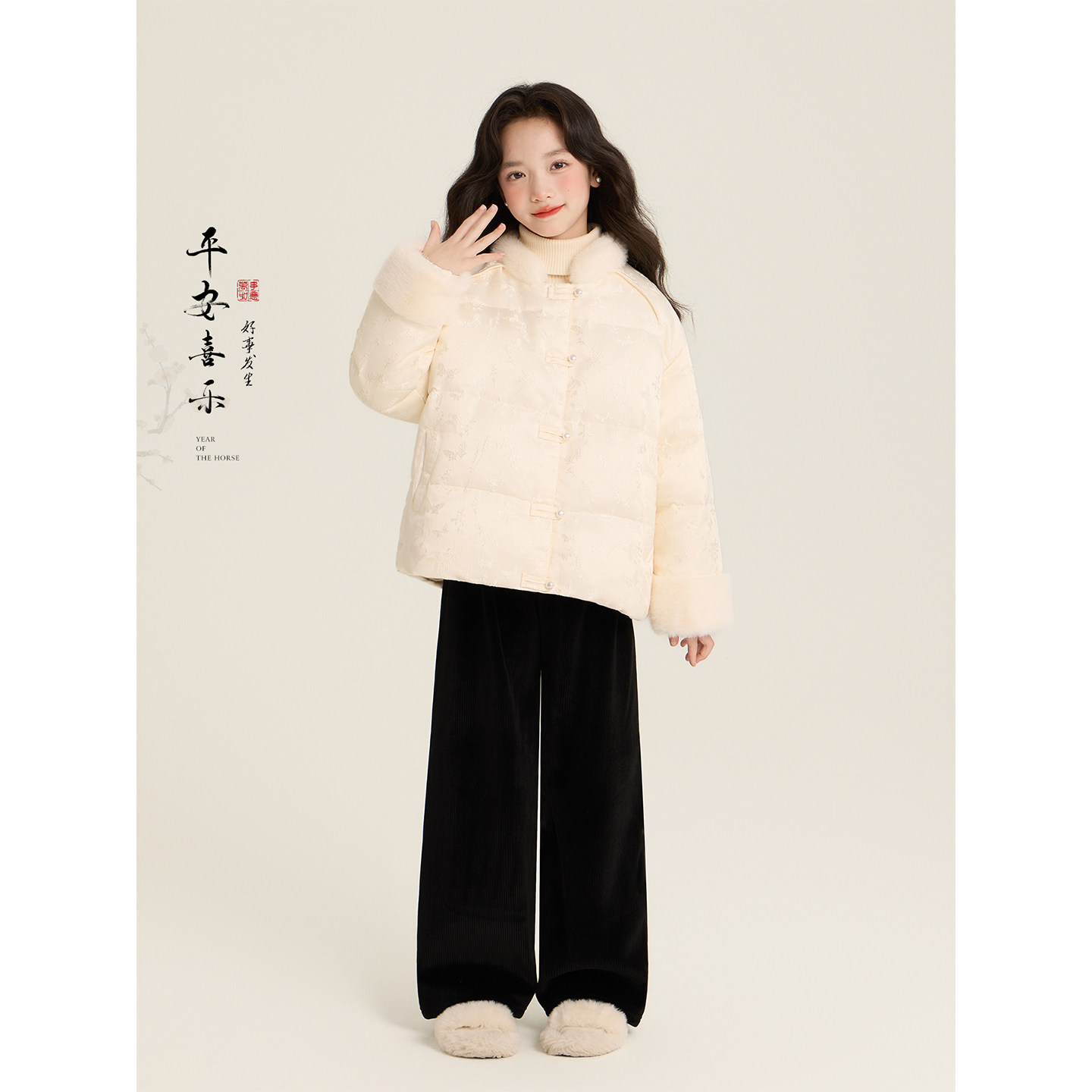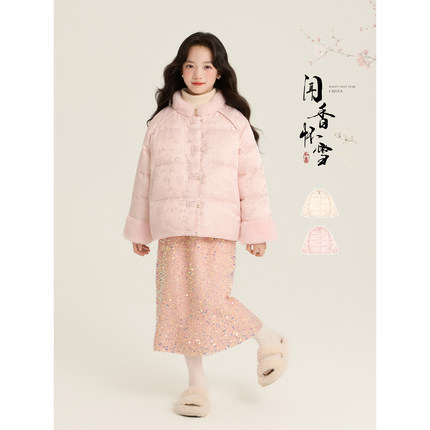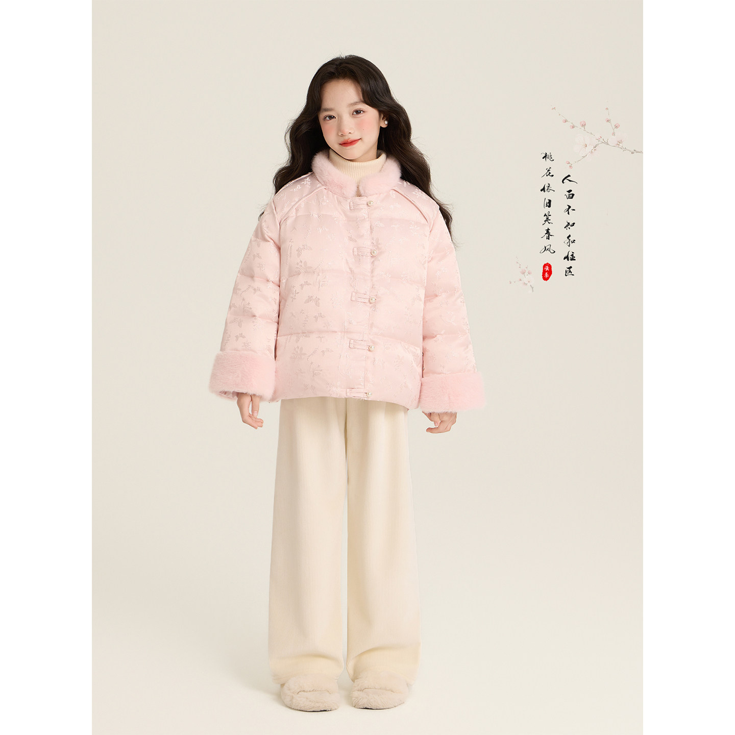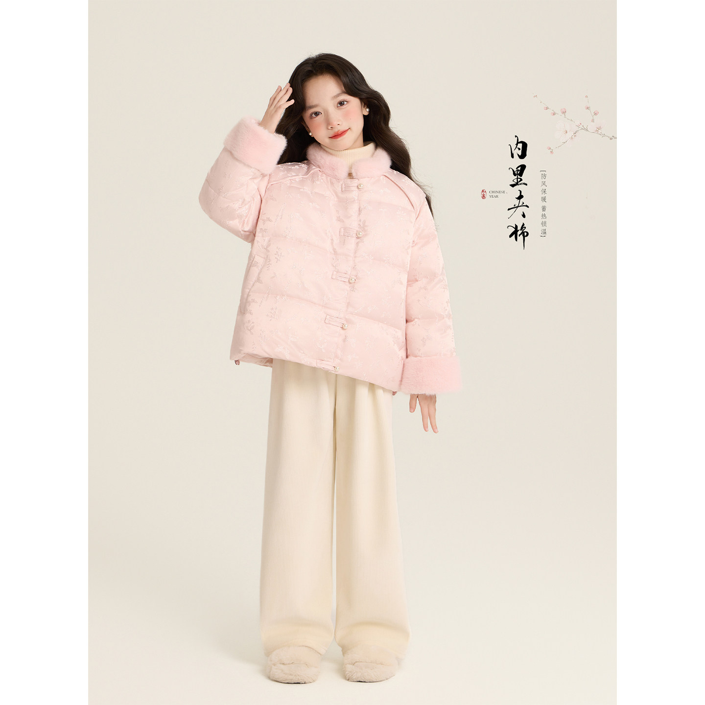 Amybaby女童上衣冬季2025新款国风设计纯色排扣毛毛领棉服外套