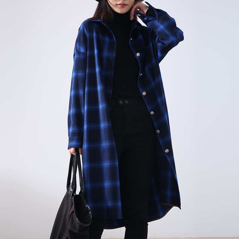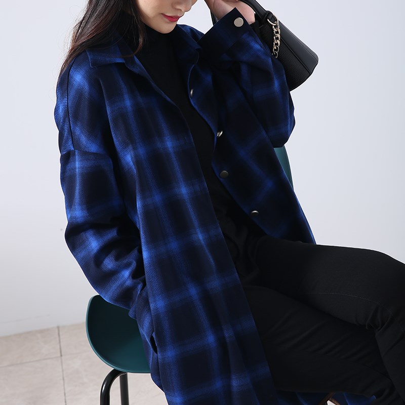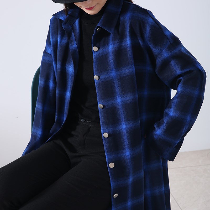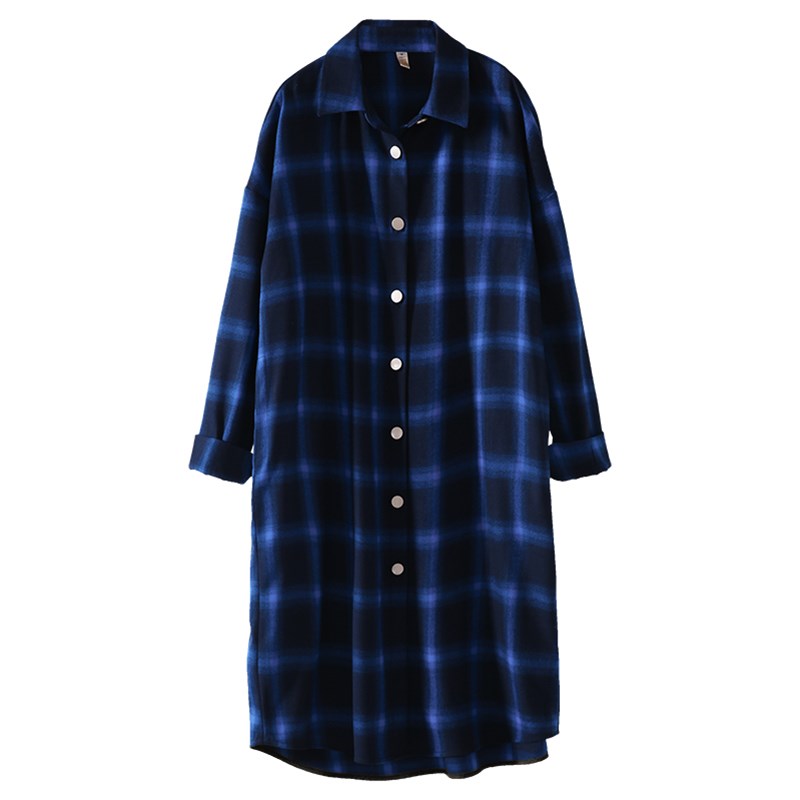 格子女衬衫长袖2023春秋新款中老年衬衣蓝色中长款过膝妈妈装外套
