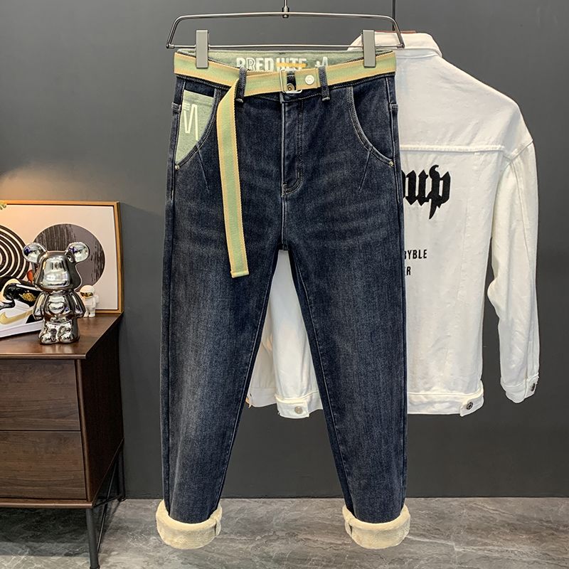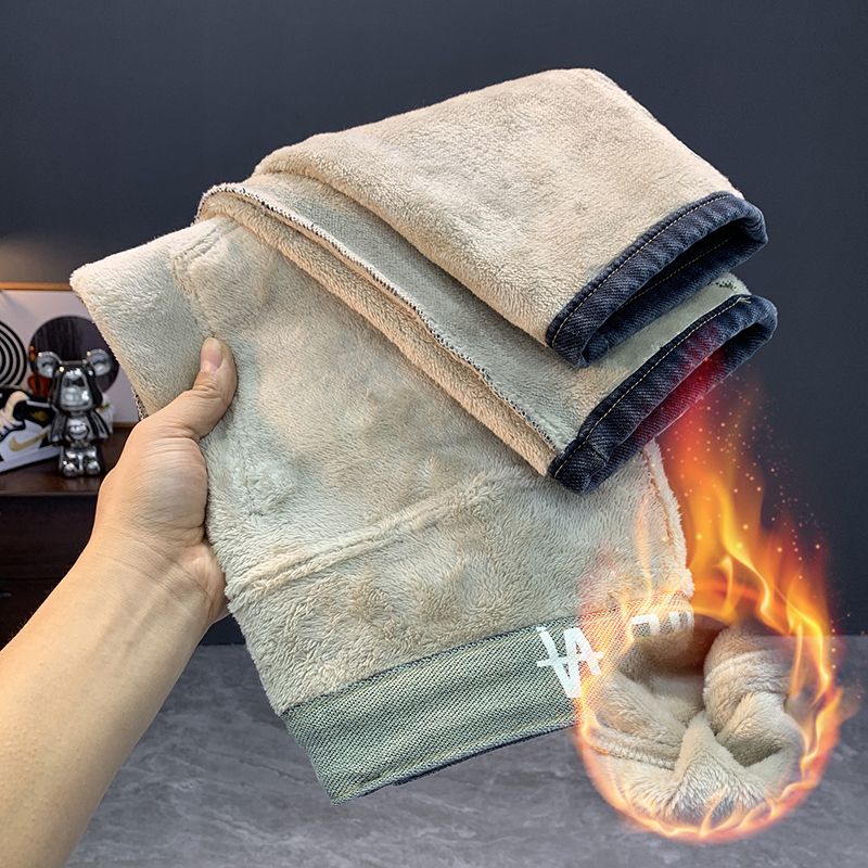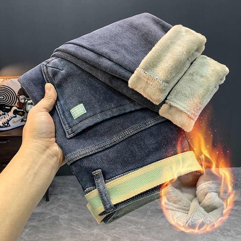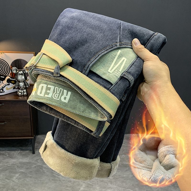 冬季加绒加厚保暖修身牛仔裤男士休闲潮流美式斜插小脚加棉长裤子