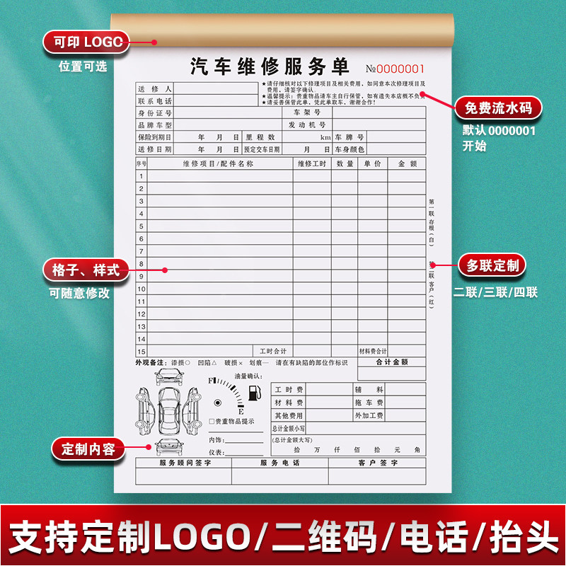 汽车维修服务单二联修理厂施工结算清单汽修接车单据保养工单2联