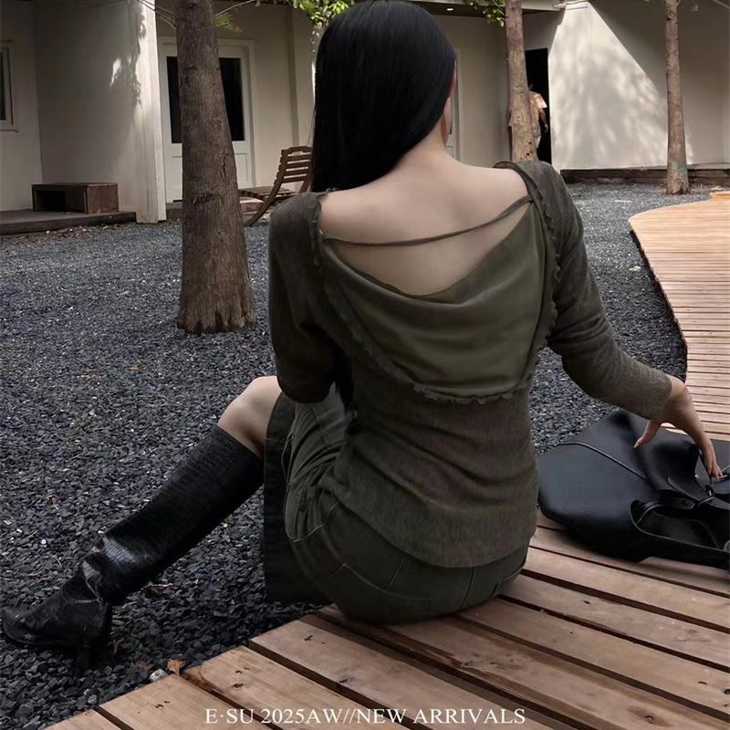 Esu2025秋季新款设计感后背镂空长袖T恤时尚辣妹纯欲微透气质上衣