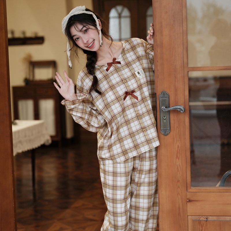 芬腾睡衣女春夏季2025新款长袖薄款格子大码春秋款休闲家居服套装