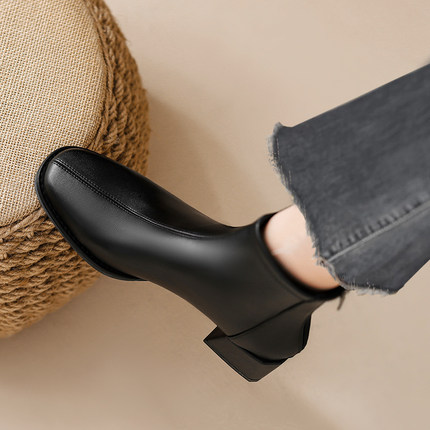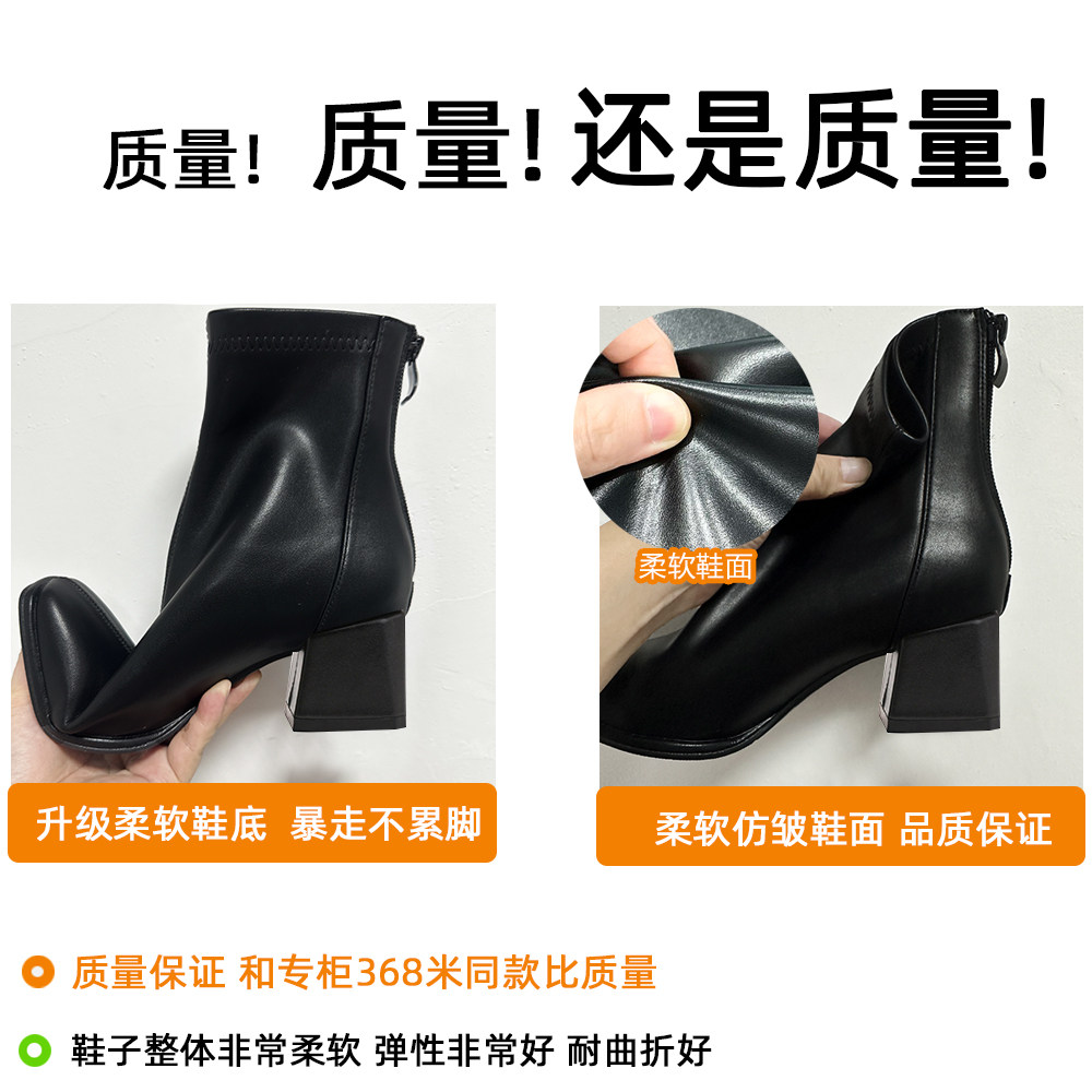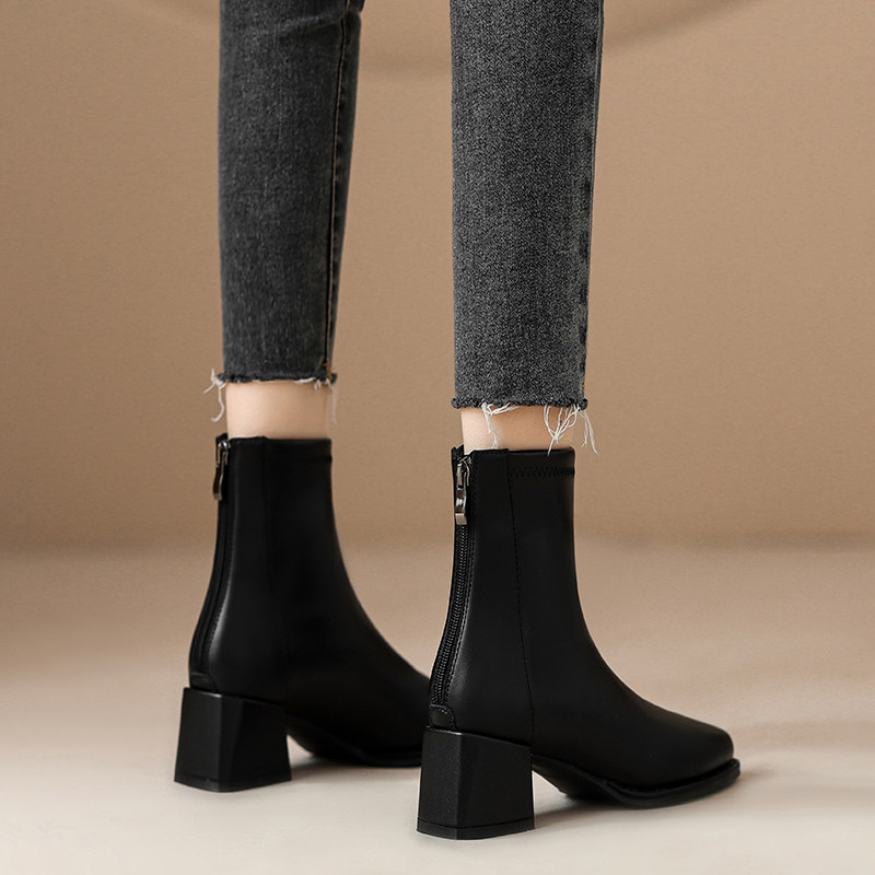 真皮版~洋气小短靴女粗跟秋冬新款方头法式瘦瘦靴高跟单靴女靴子