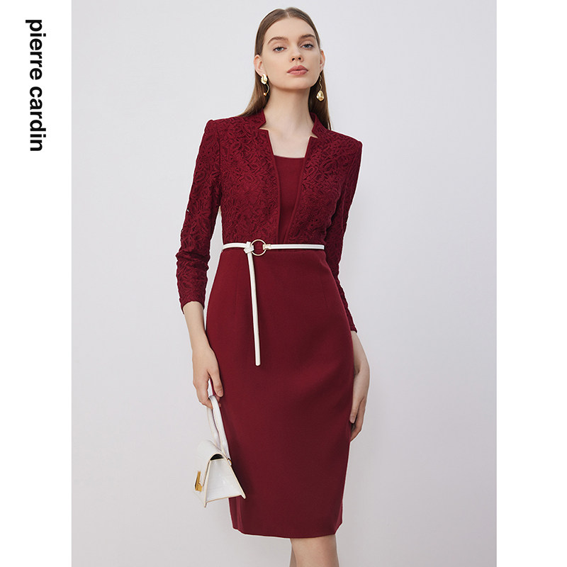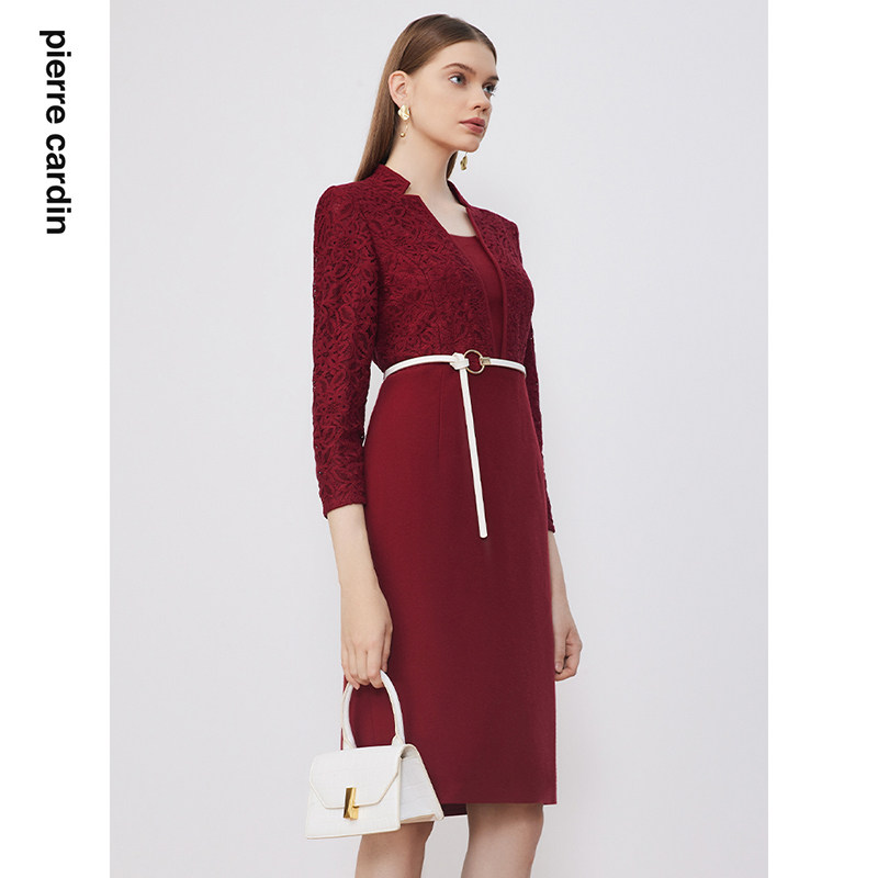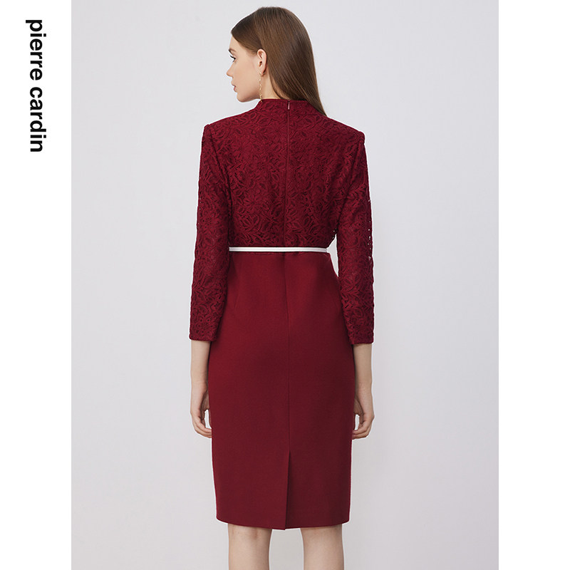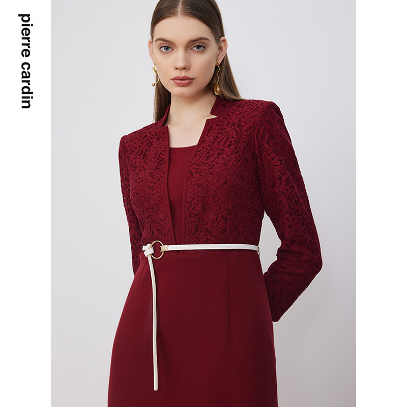 商场同款皮尔卡丹女装淑女蕾丝拼接毛呢通勤复古修身连衣裙