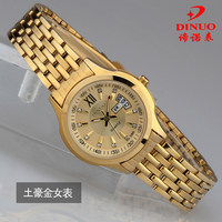 正品谛诺手表 女士双历夜光石英表 防水复古超薄时尚休闲金色女表