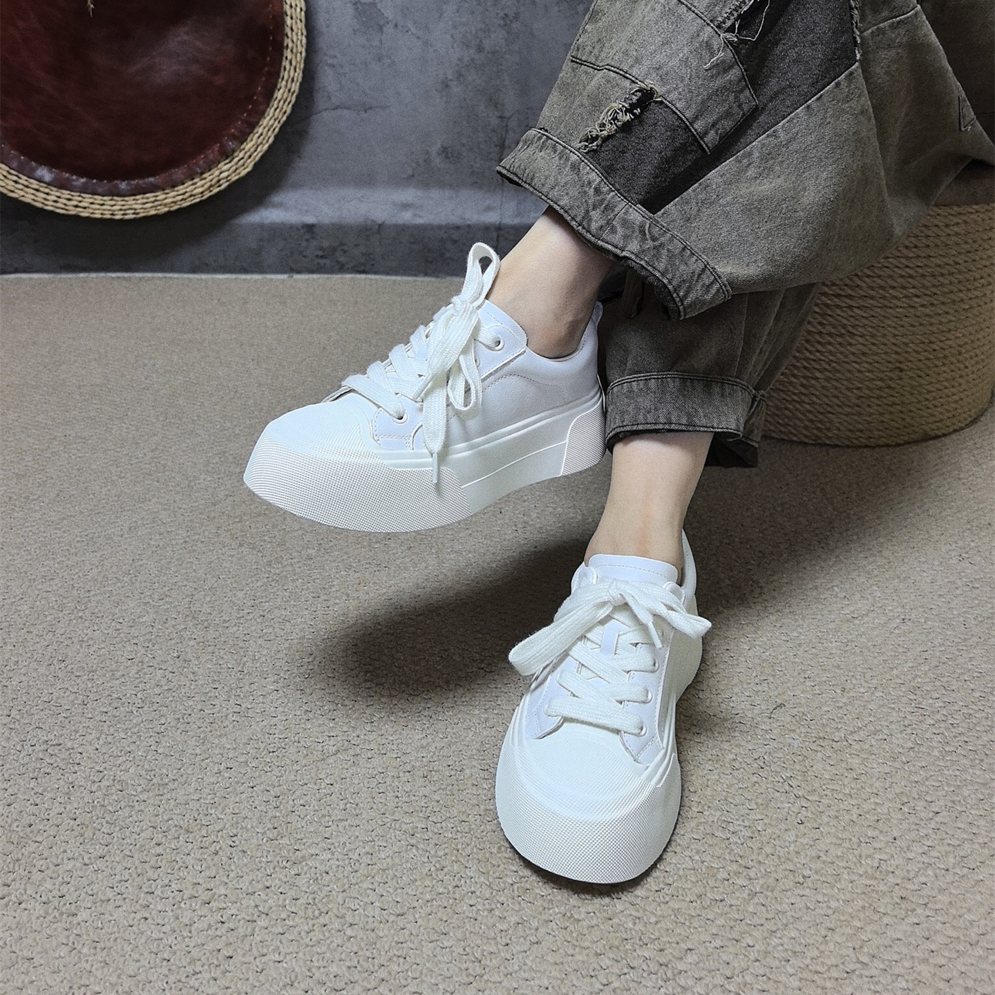 四月倾城真皮厚底小白鞋女2025秋季新款系带百搭运动风休闲鞋板鞋