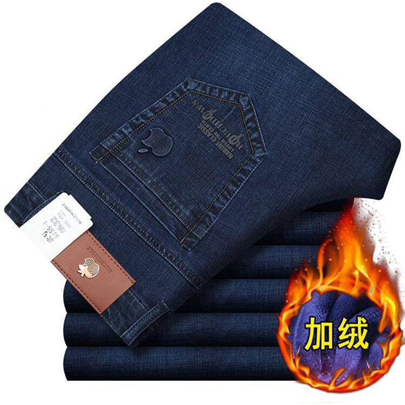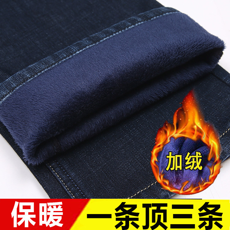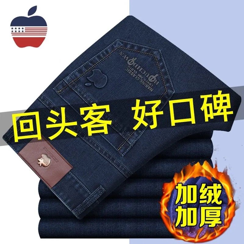 冬季加绒加厚款弹力苹果牛仔裤男宽松休闲大码深裆直筒高腰中老年