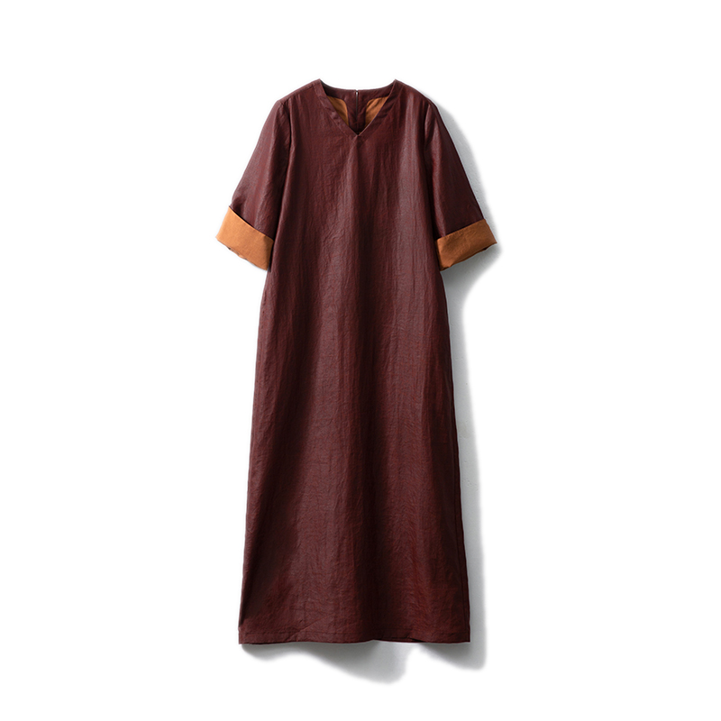 丝艺 红云龟油皮老料100%桑蚕丝真丝连衣裙香云纱V领直筒长裙早秋