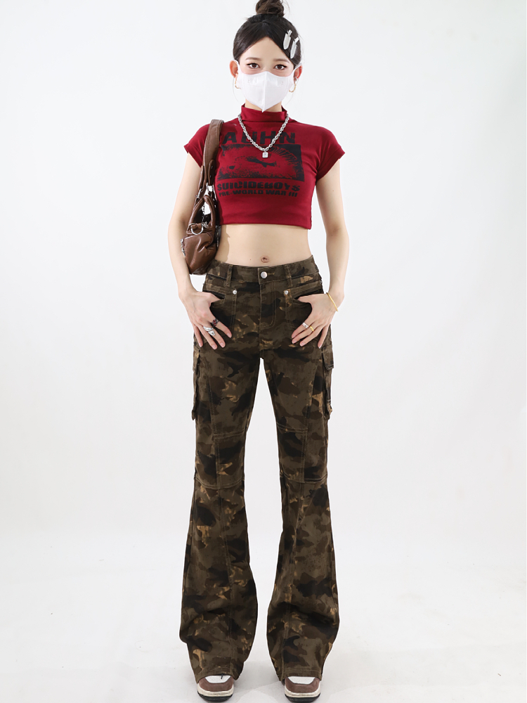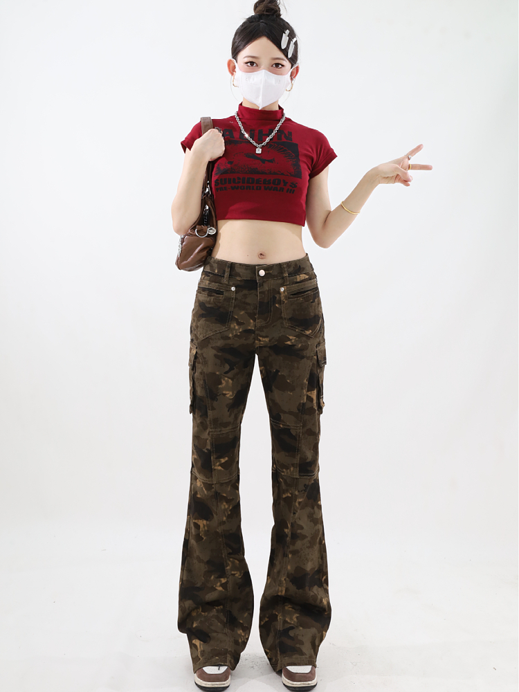 美式复古迷彩多口袋工装牛仔裤女新款高街嘻哈直筒显瘦微喇叭长裤