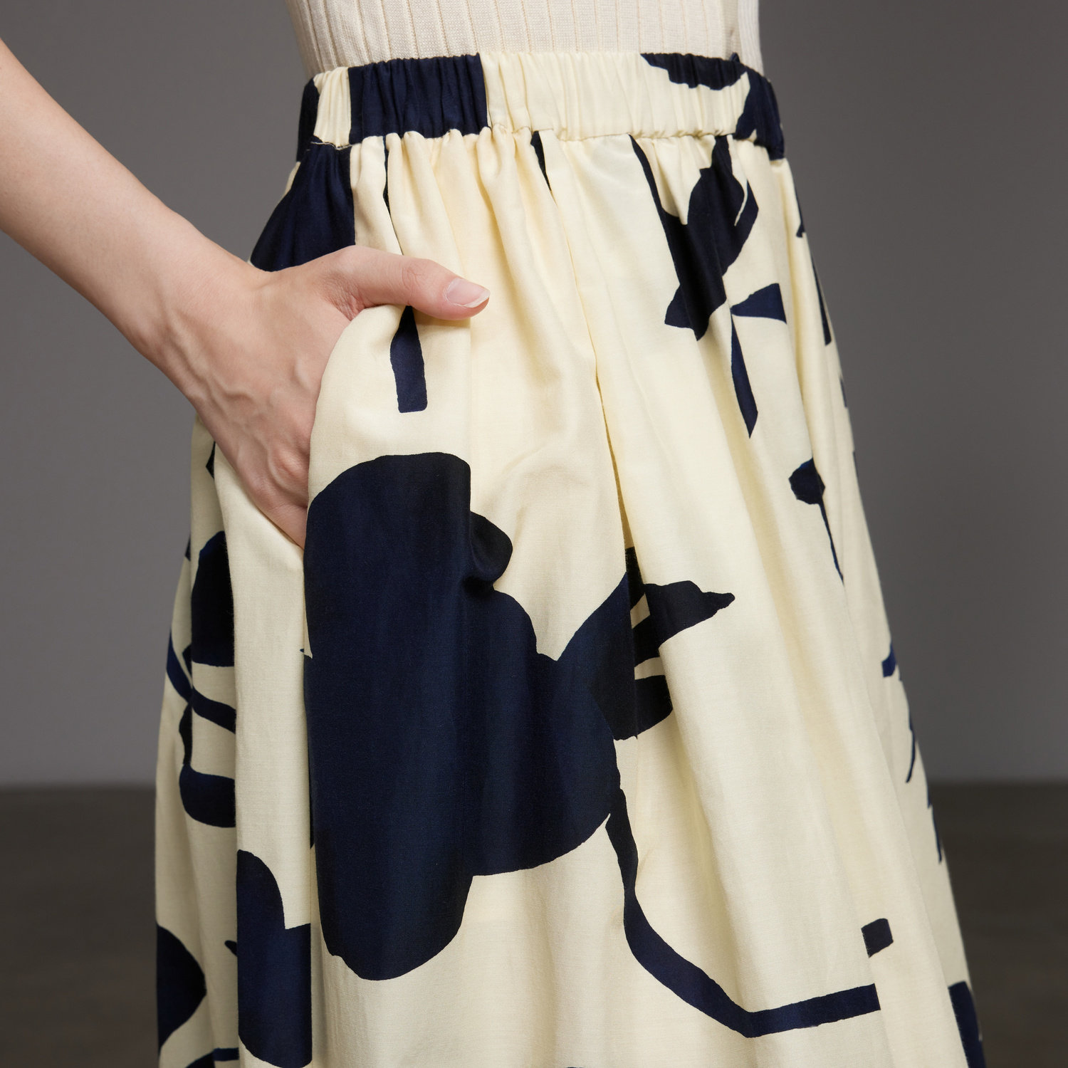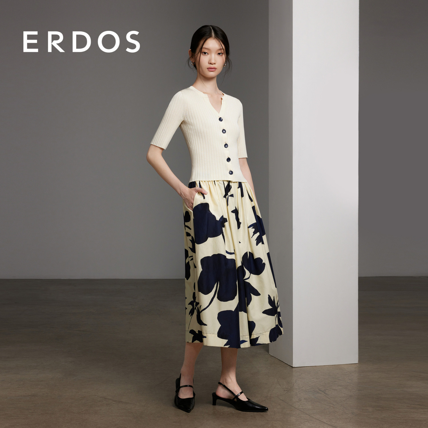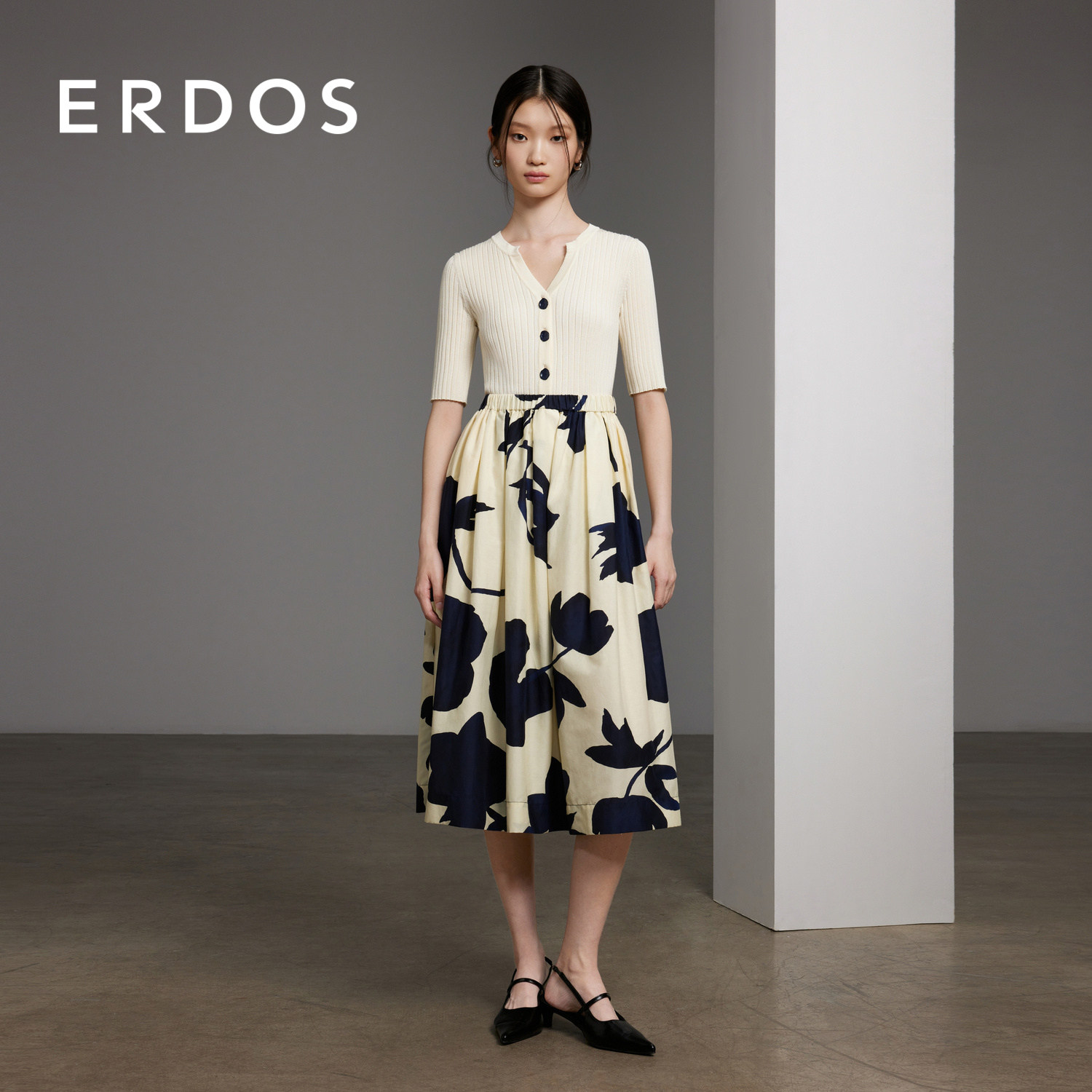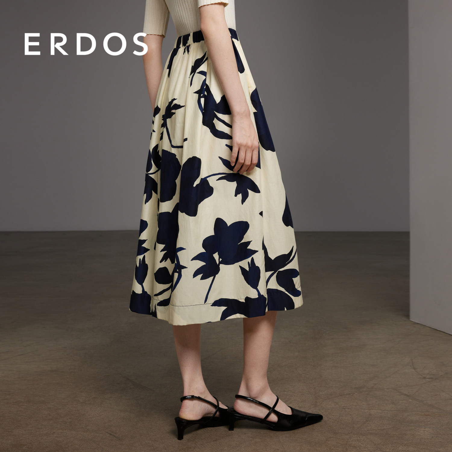ERDOS 复古优雅印花半身裙女夏丝棉混纺松紧腰中长款大摆A字伞裙