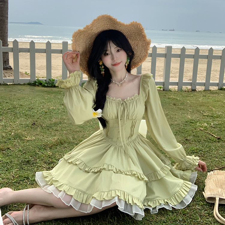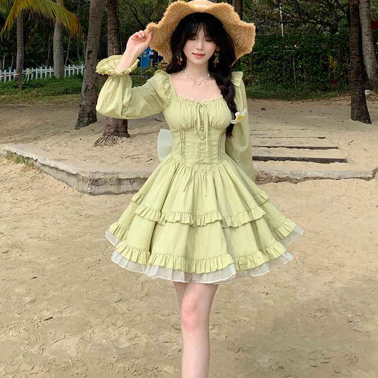 法式千金感绿色方领连衣裙女早秋新款设计感抽绳收腰显瘦蓬蓬短裙