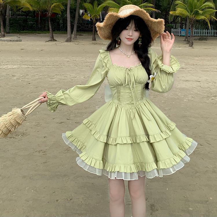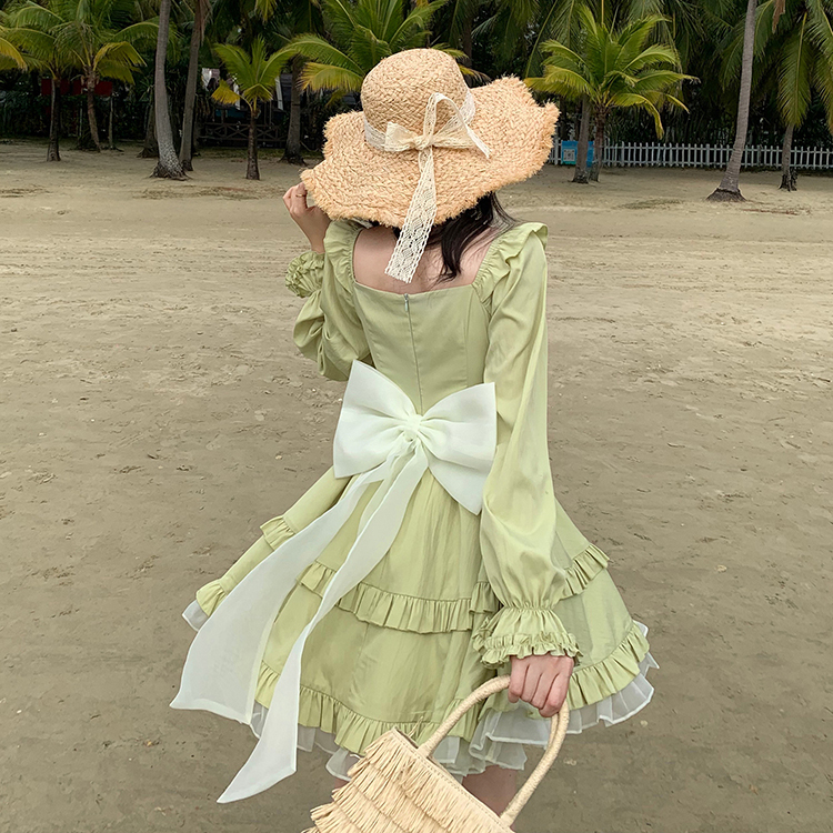 法式千金感绿色方领连衣裙女早秋