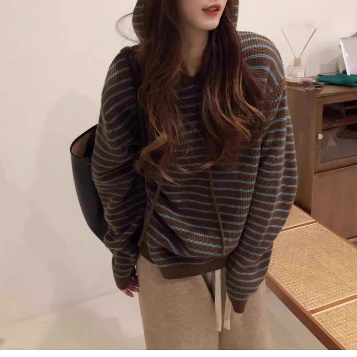 秋季慵懒风穿搭针织上衣女连帽时尚条纹套头洋气韩系宽松毛衣外套