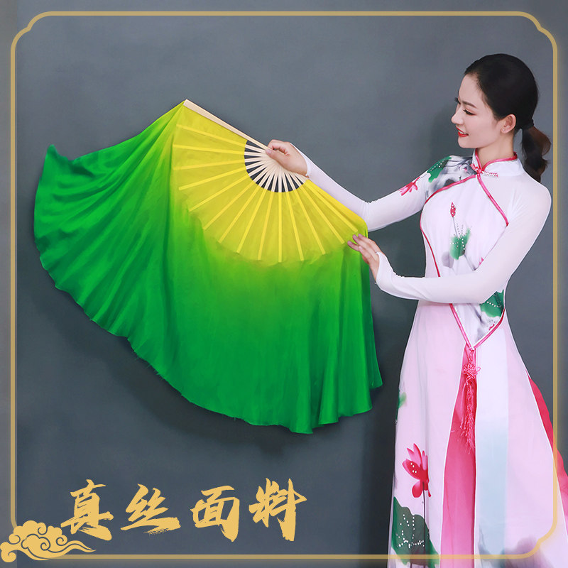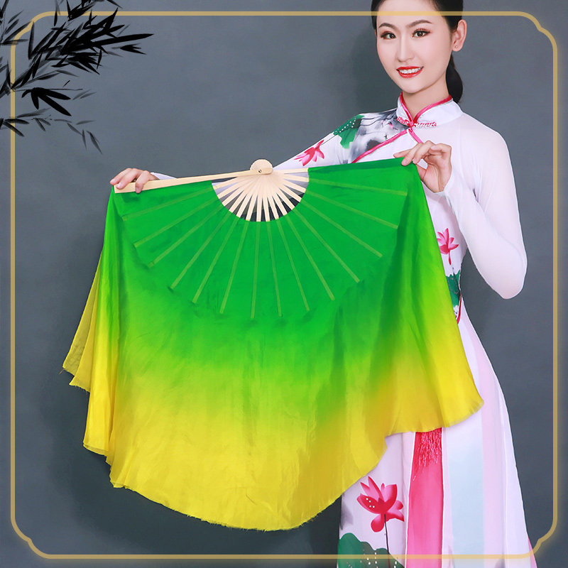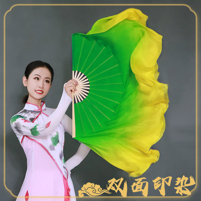 胶州古典真丝双面黄绿渐变长稠扇舞蹈扇海派秧歌扇表演道具扇子