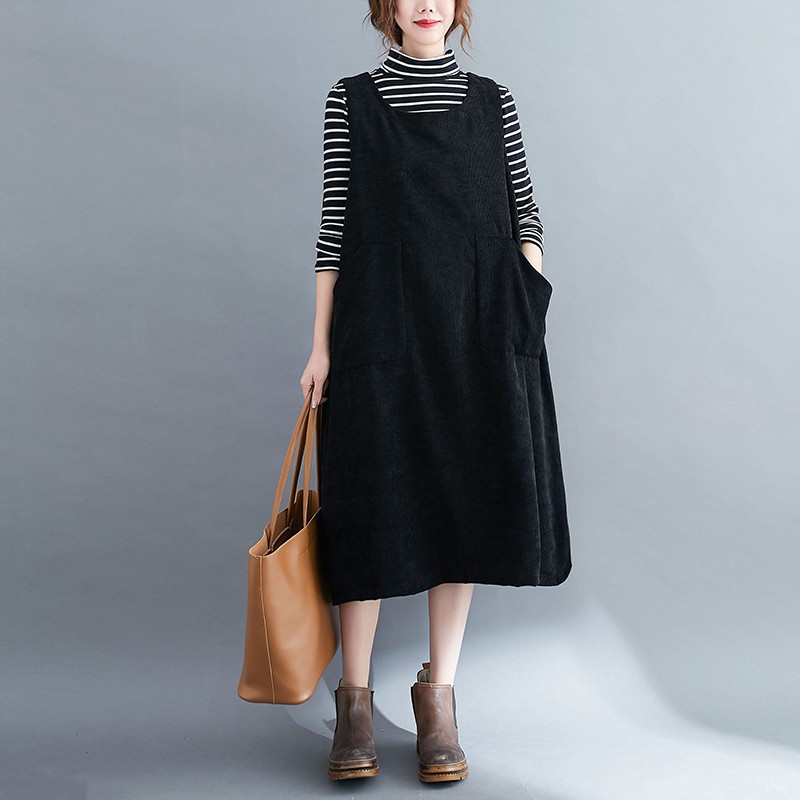 秋冬复古文艺大码中长款条绒背心裙女胖MM宽松大口袋灯芯绒连衣裙
