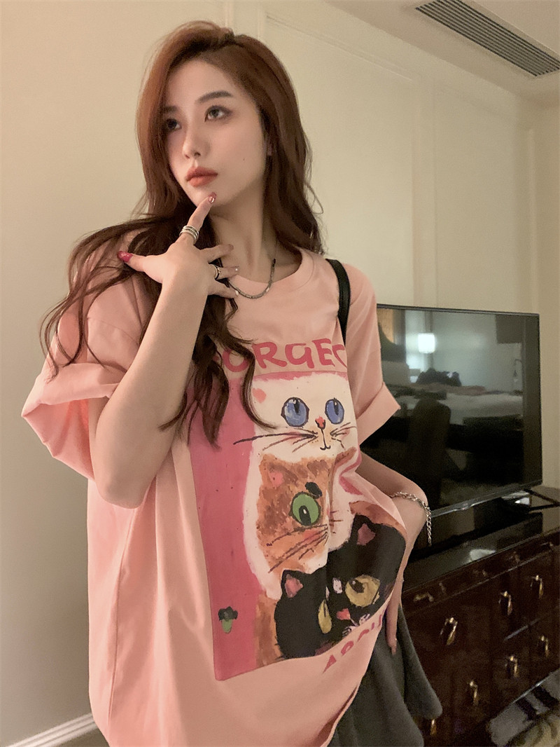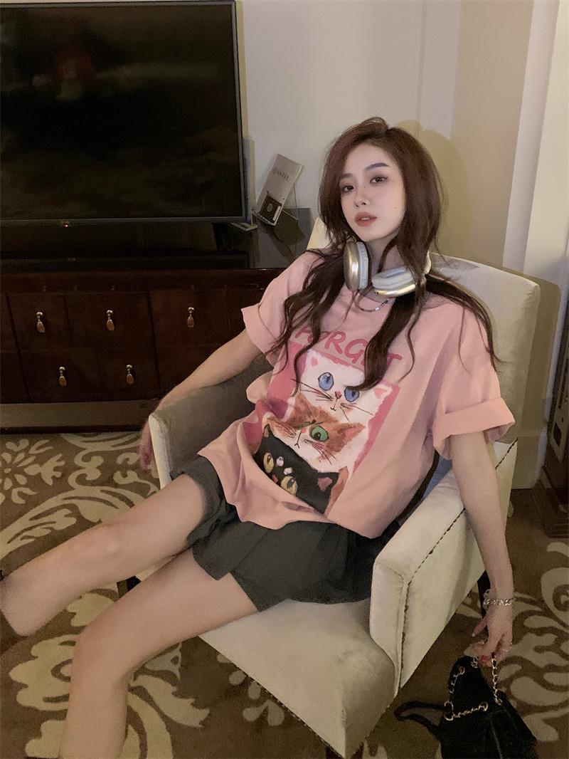 韩版宽松小众甜美粉色猫咪短袖T恤女夏季慵懒休闲显瘦半袖上衣