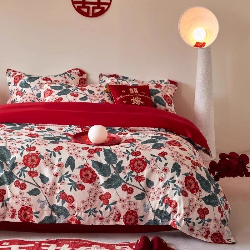 简约陪嫁结婚四件套大红色新z婚床单被套婚庆床上用品婚房喜被