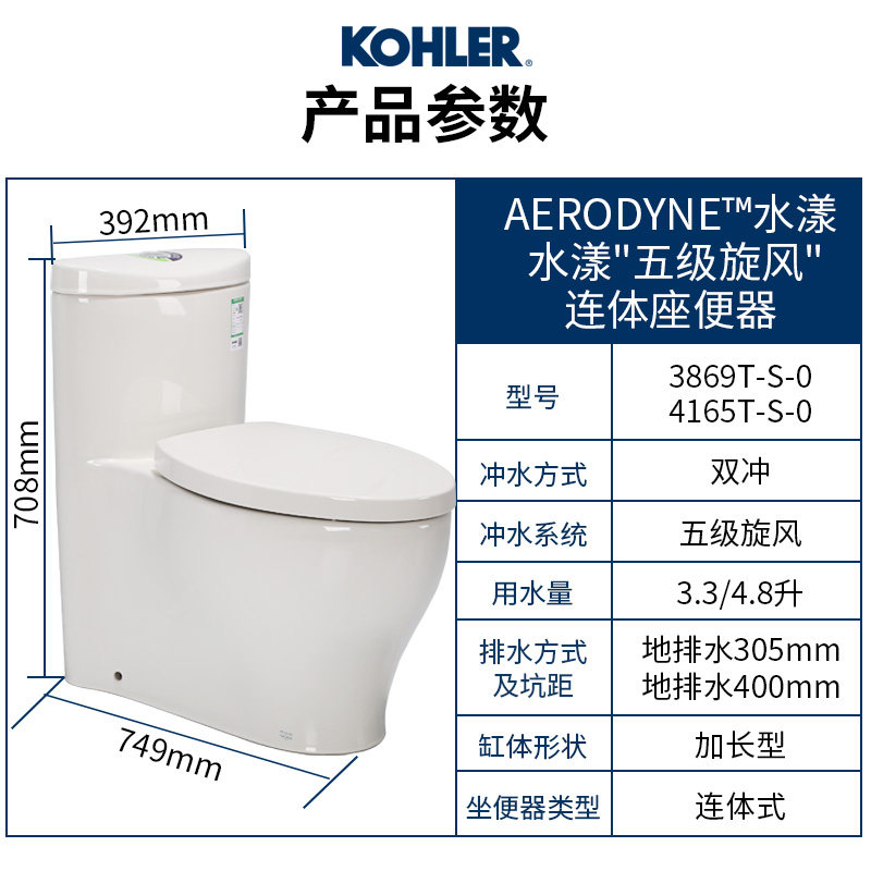 科勒坐便器家用卫生间陶瓷虹吸式连体马桶K3869T水漾五级旋风马桶