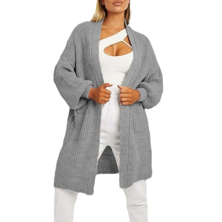 新款外贸亚马逊秋冬灯笼袖开衫毛衣欧美宽松休闲口袋女式针织衫女