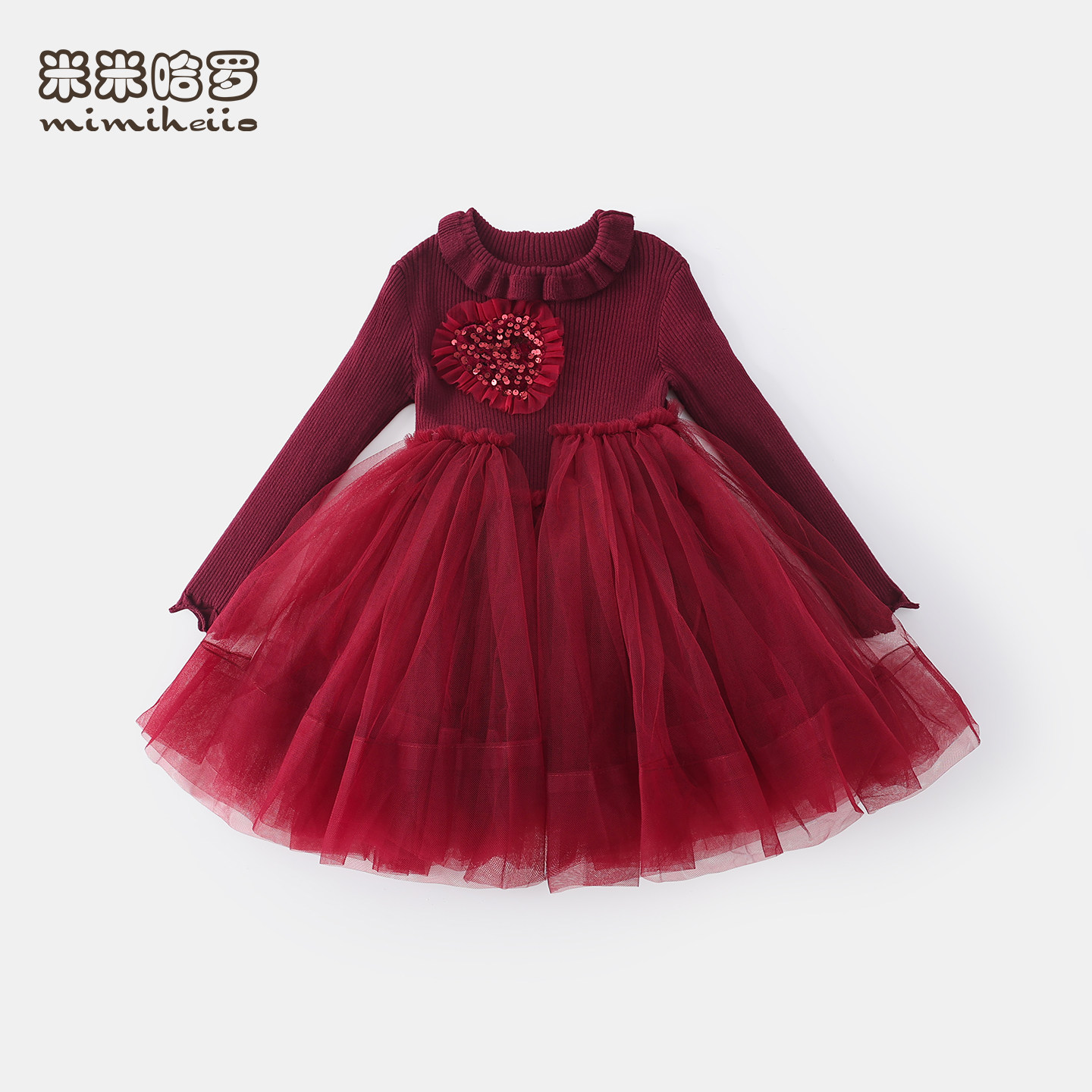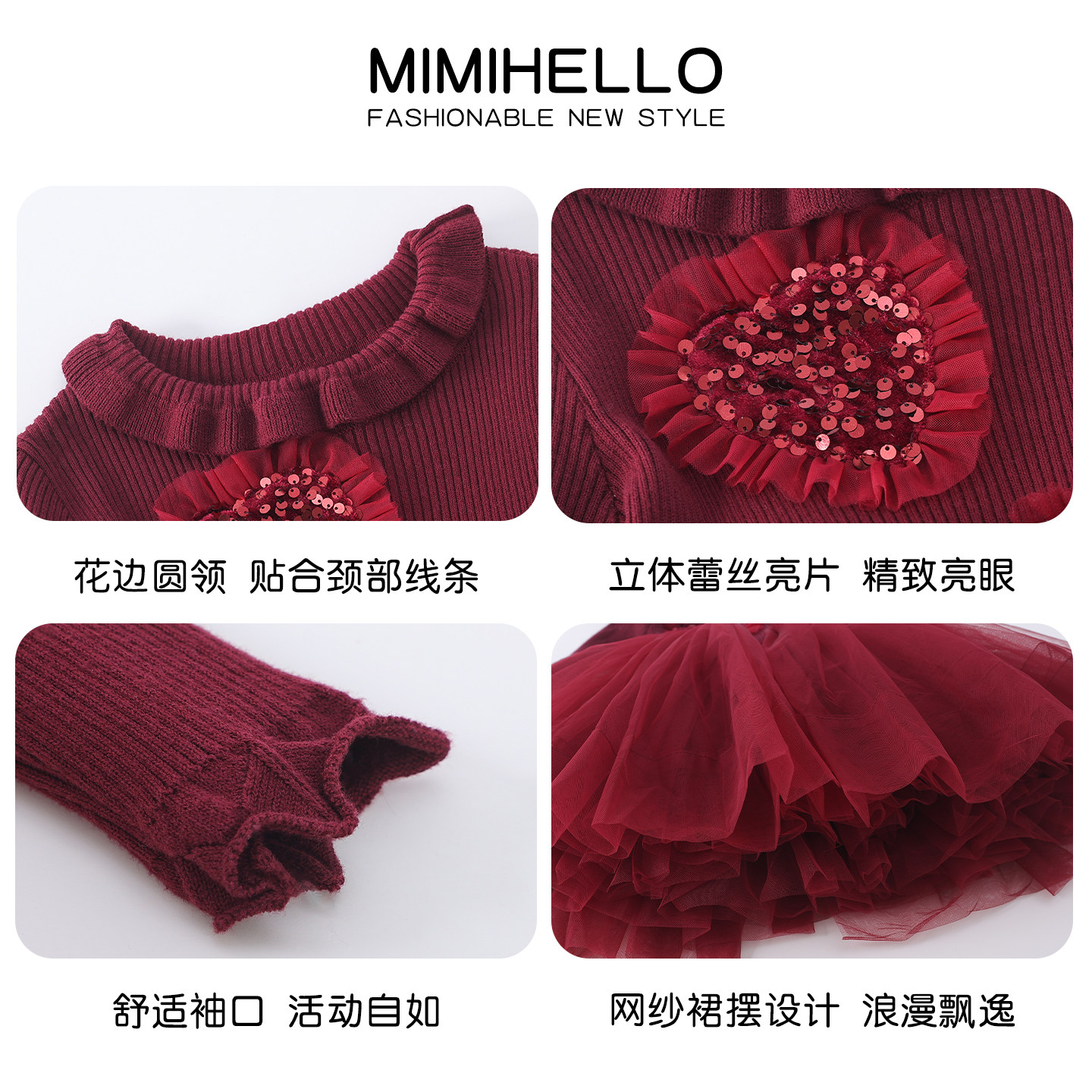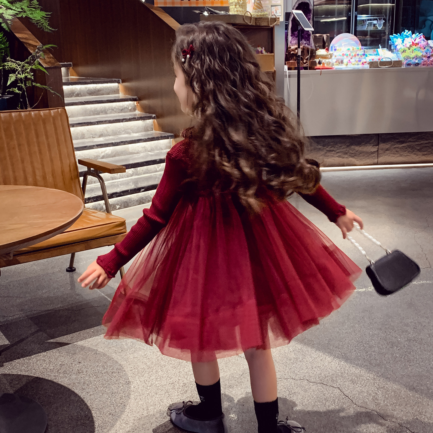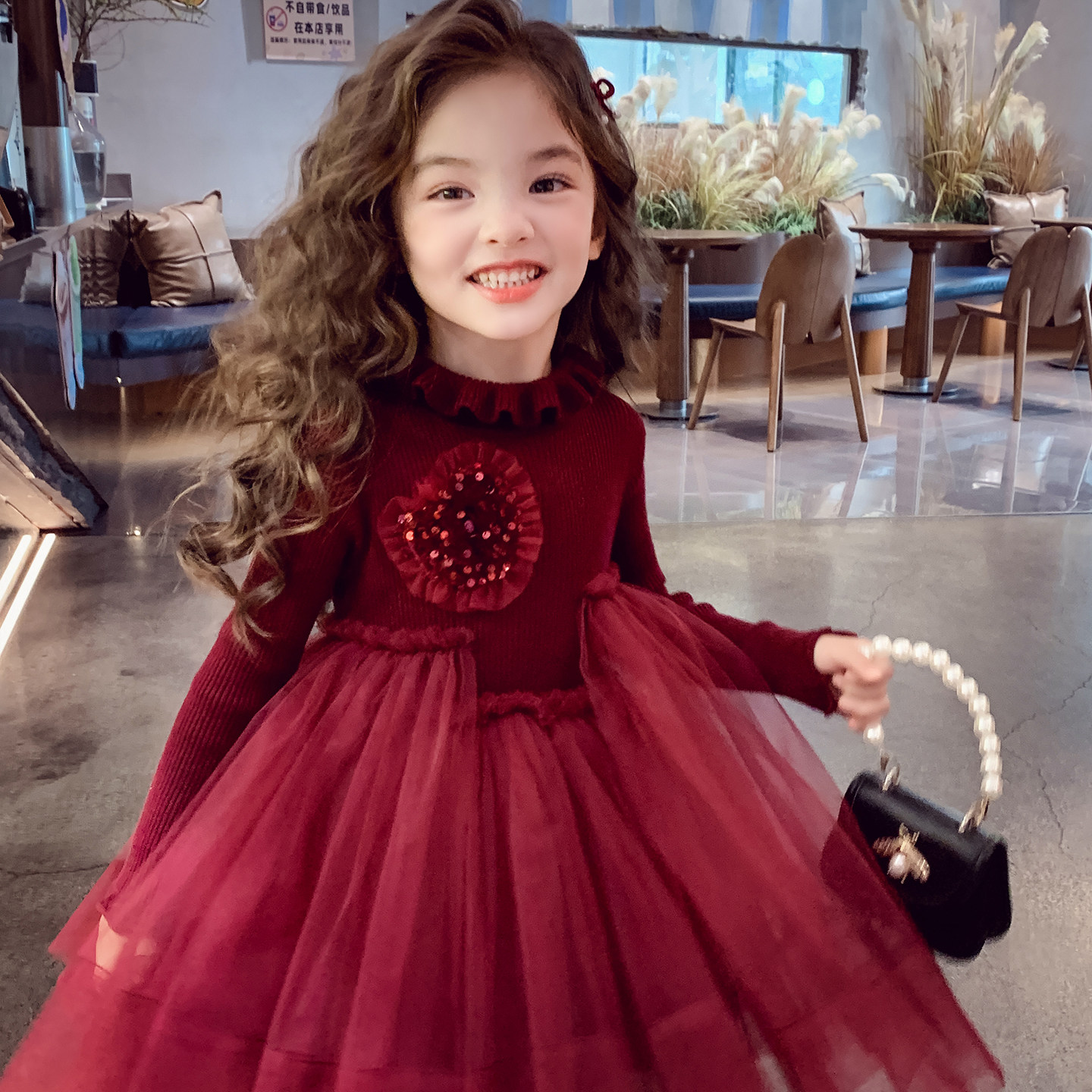 女童新年红色针织长袖连衣裙冬装2025新款拜年服网纱拼接毛衣裙子